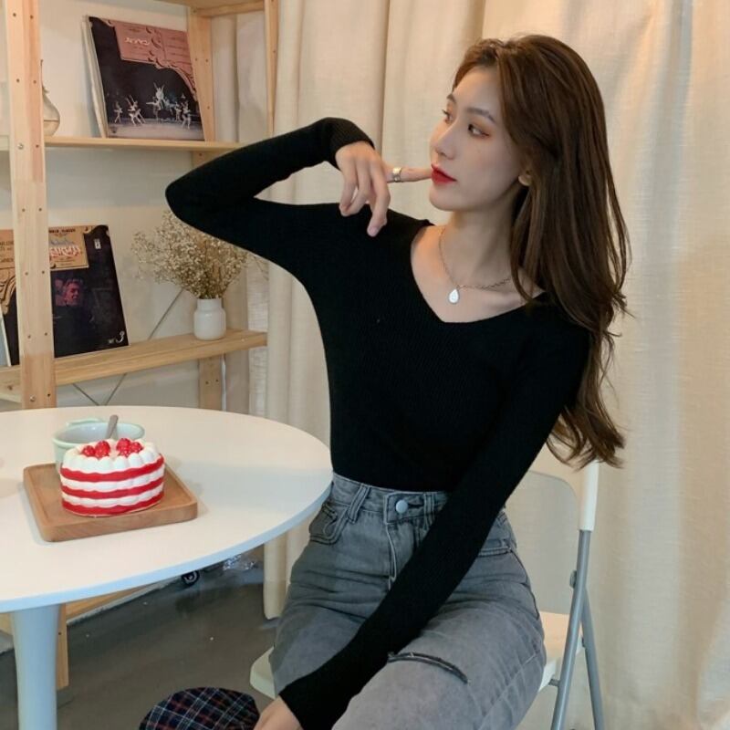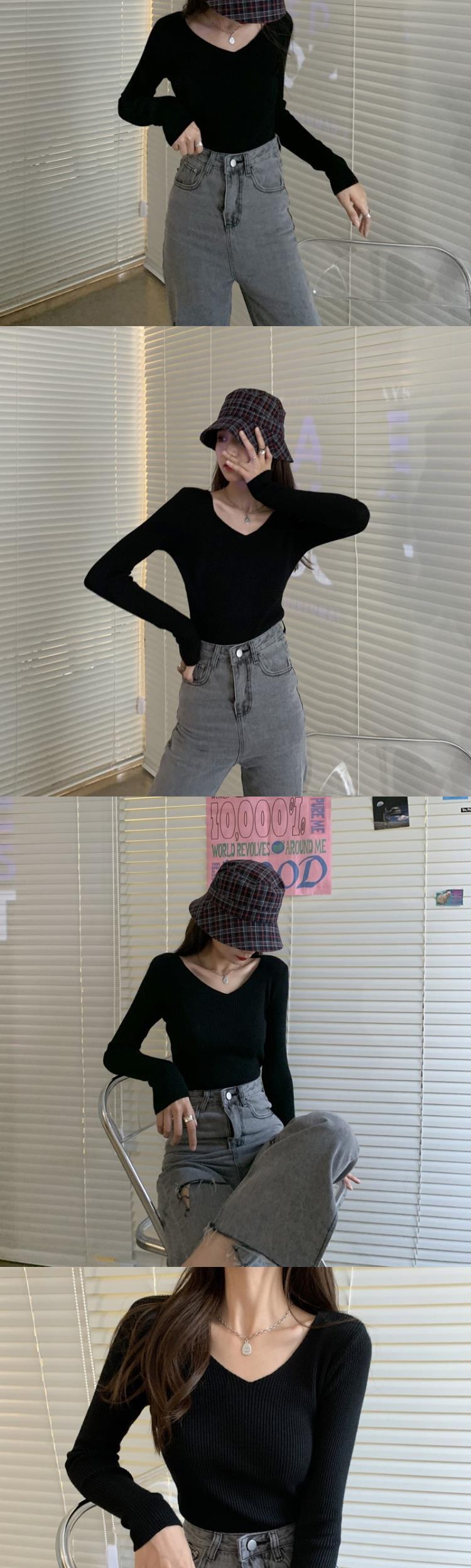 黒のインナーVメス2021年春秋新ベーススリミング長袖襟セーターセータートップ ロング ブラック スプリング 春物 オータム 秋物 TB2-6 TB2-683200864319