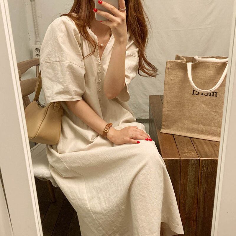 南2021年夏無地気質レトロVネックフレンチニッチワンピースやさしい風ルーズスリムロングスカート サマー 夏物 ソリッドカラー TB2-3 TB2-382618031236