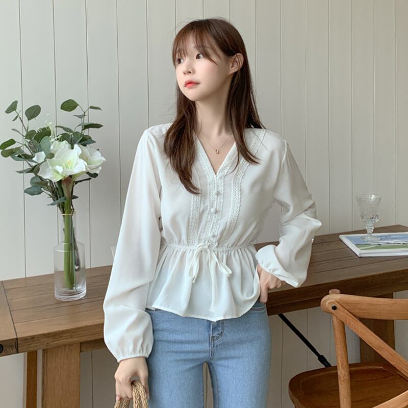 2021年秋新作インシャツデザインセンスニッチシャツ女性Vネック伸縮性ウエスト長袖ボトミングシャツトップ ロング エラスティック オータム 秋物 TB2-3 TB2-35121619429