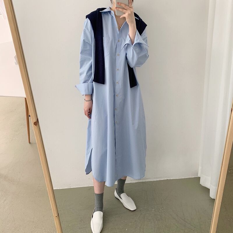 シックなニッチミルクソフトブルーラペルシングルブレストルーズカジュアルオールマッチミドル丈シャツドレス女性 TB2-3 TB2-370446177853