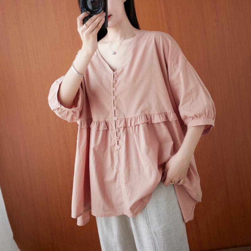 2021年夏の年齢を減らすコットンとリネンのカジュアルトップス、無地、ルーズ、ベリー、シン、プラスサイズの女性用オールマッチシャツ 大きめサイズ サマー 夏物 ソリッドカラー TB2-12 TB2-1270696038823