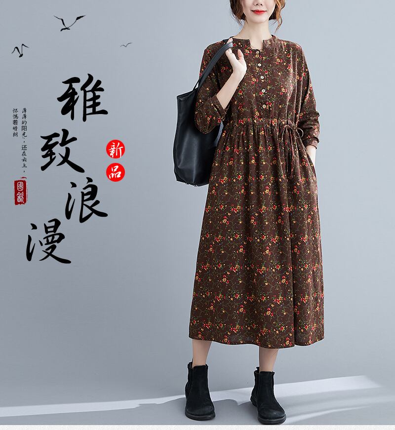 花柄のコットンとリネンのドレスミッドレングス2021年春と秋の女性の新しいスタイルのレースアップウエストと薄い長袖の膝上スカート ロング スプリング 春物 オータム 秋物 TB2-12 TB2-1292842773400