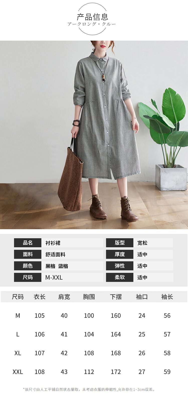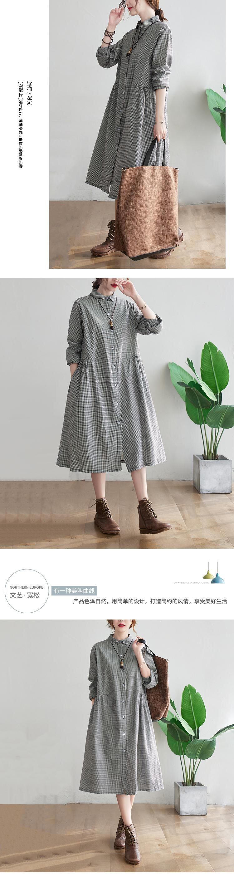 チェック柄シャツスカート女性2021年春新バージョンルーズラージサイズミドル丈ファッションコットン&リネン長袖ワンピース ロング 大きめサイズ スプリング 春物 TB2-8 TB2-821386555075
