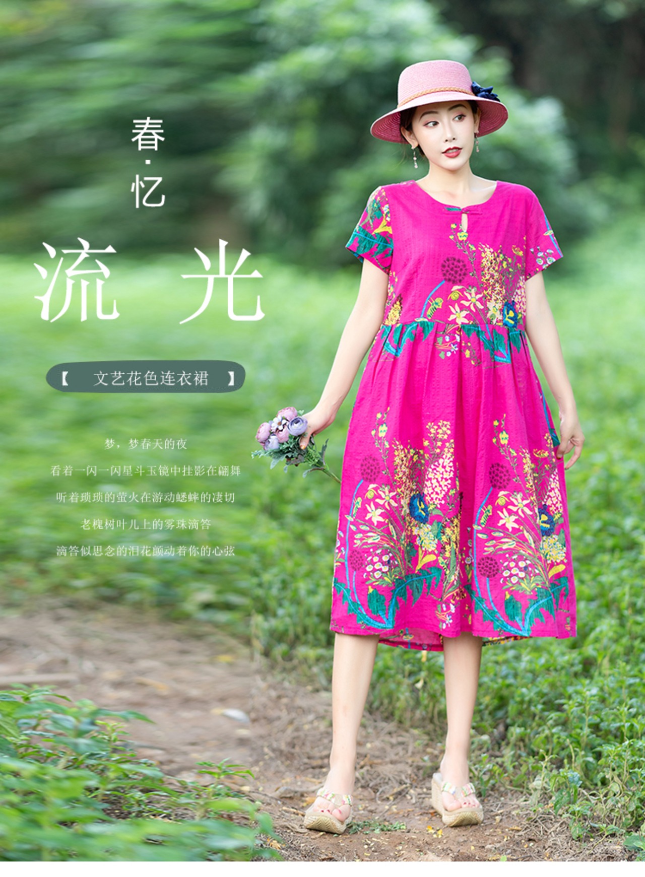 エスニックスタイルの女性の2020年夏の新しいルーズラージサイズのコットンとリネンのドレスプリントディスクボタン半袖ミドル丈スカート 大きめサイズ サマー 夏物 TB2-12 TB2-1222020581245