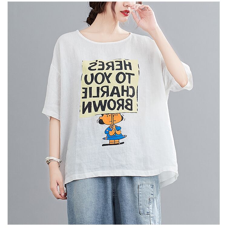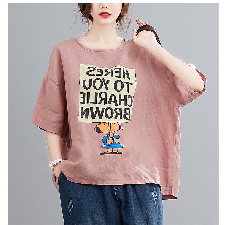 2021年夏の文学とアートプラスサイズの女性の手紙を印刷する半袖Tシャツルーズで薄いワイルドな薄い綿とリネンのトップ コットン 大きめサイズ サマー 夏物 TB2-12 TB2-1225686600212