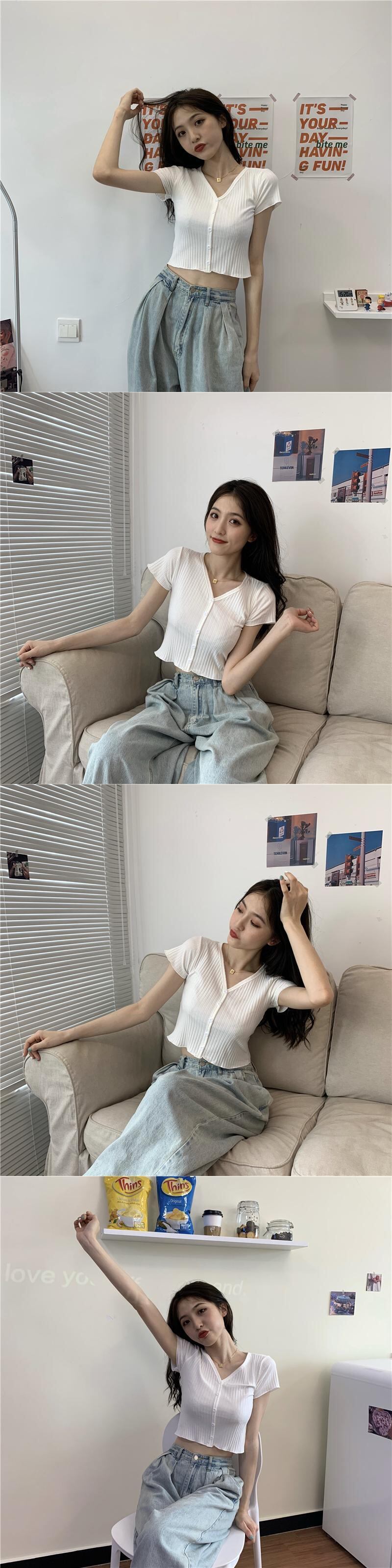 夏の半袖2021年の新しい女性用Tシャツ、木製の耳付きVネックbmクロップドトップ、ハイウエストパンツと小さなカーディガン ハイウェスト サマー 夏物 TB2 TB259879390303