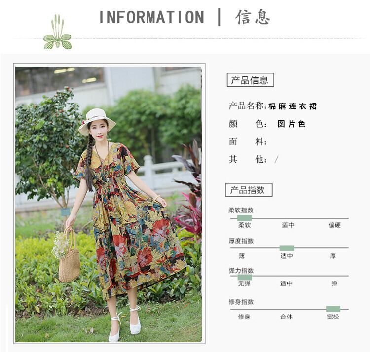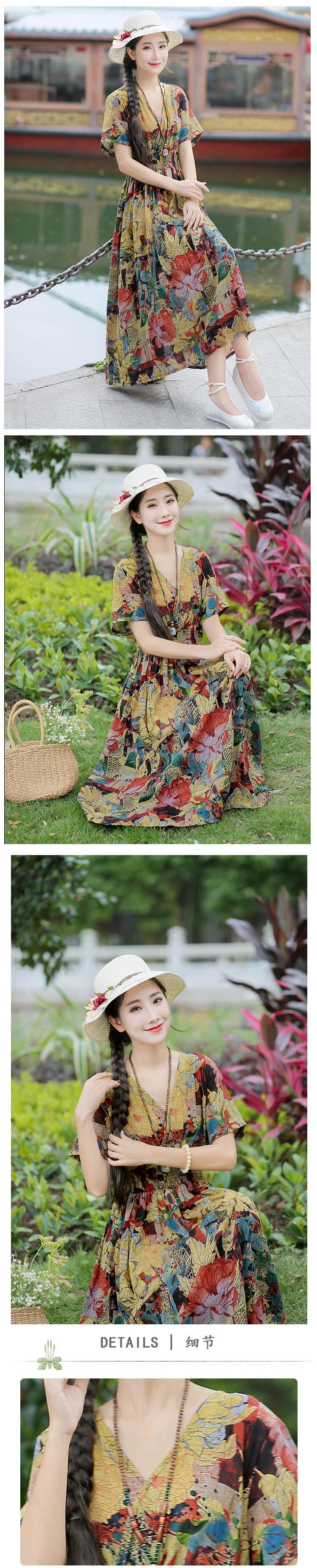 レトロなエスニックな女性の夏のVネックプリントウエストスリミングルーズラージレングススカートコットンとリネン半袖ドレス ショート ハーフスリーブ サマー 夏物 TB2-12 TB2-124776576219