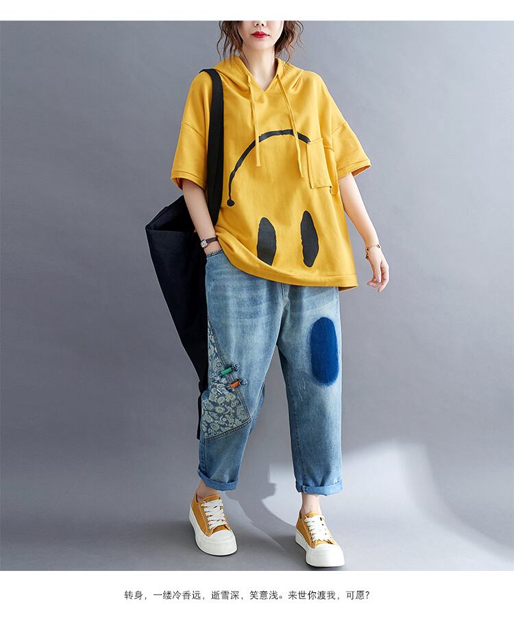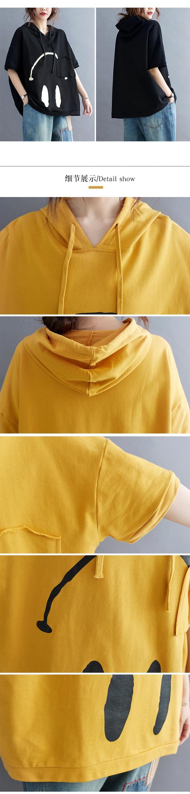 2021年夏新バージョンルーズラージサイズ文芸フード付き巾着プリント半袖セーターTシャツ 大きめサイズ サマー 夏物 TB2-12 TB2-1285553793965