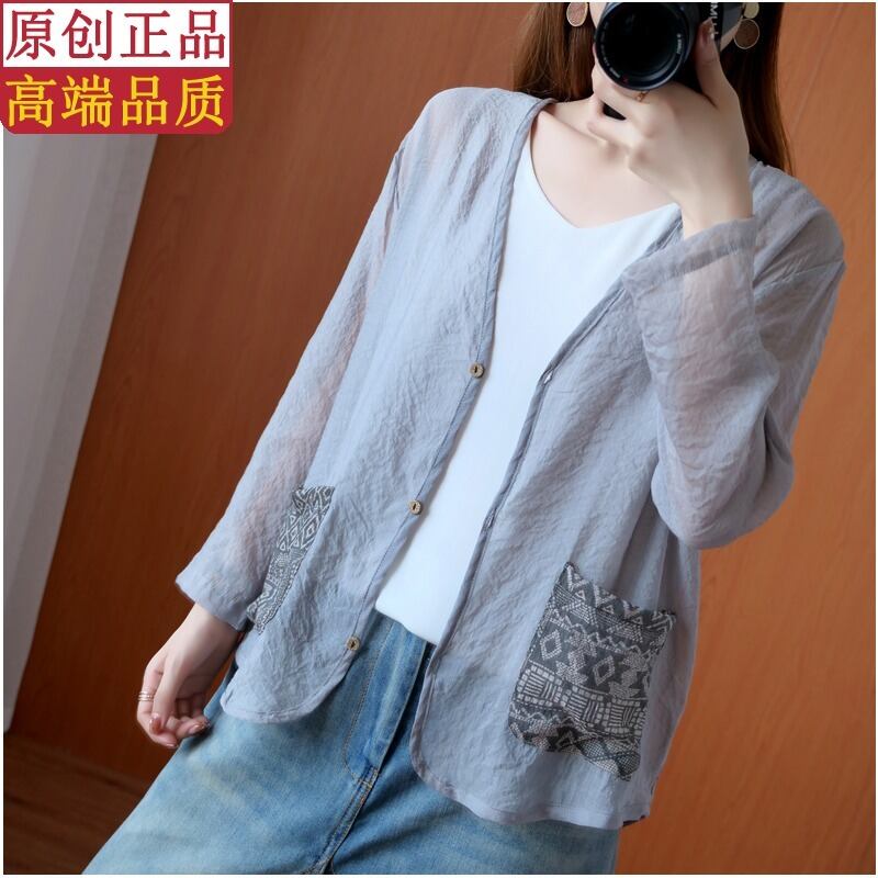 夏のルーズ薄片プリントスプライシングシルクとリネン長袖日焼け止め服Vネックワイルドエアコンシャツショートカーディガン ロング サマー 夏物 TB2-12 TB2-12642797104