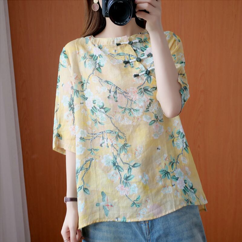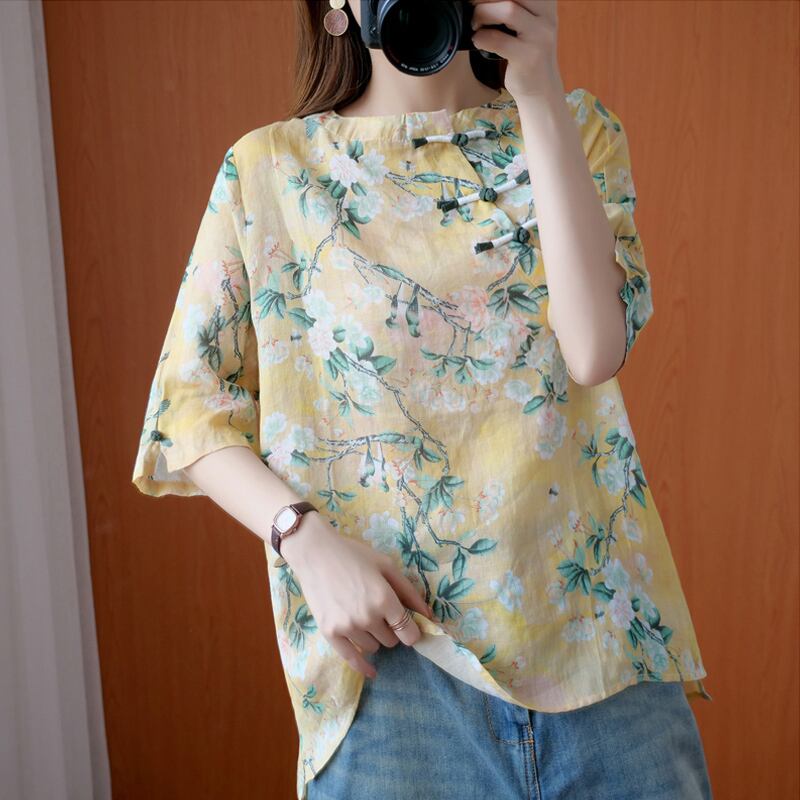 2021年夏のエスニックスタイルのディスクボタンプリントコットンとリネンミドルスリーブシャツレディースルーズラージサイズ文学年齢を減らすリネントップ 大きめサイズ サマー 夏物 TB2-12 TB2-122097509493
