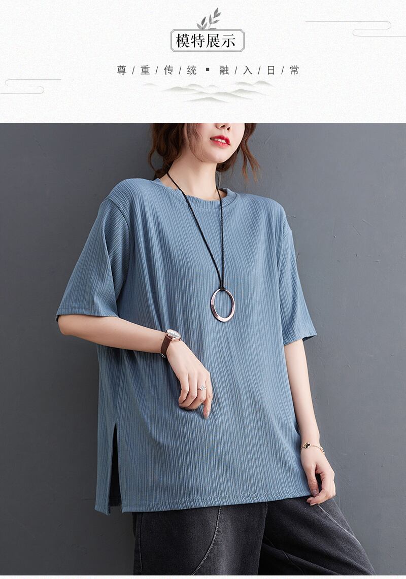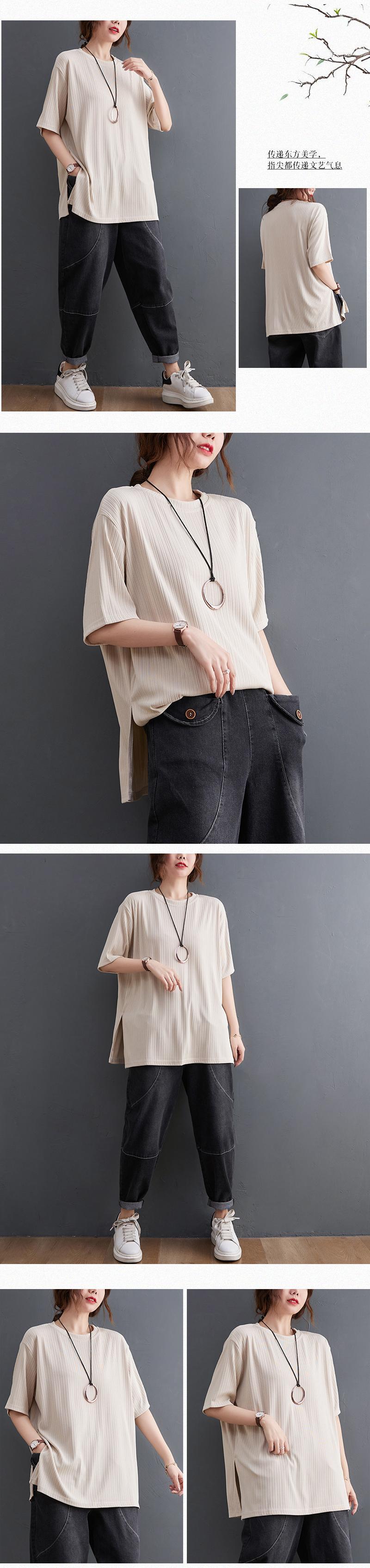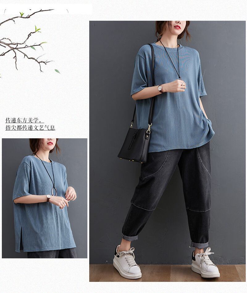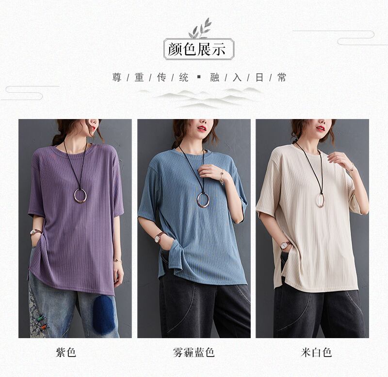 2021年夏の文芸無地ピットストリップラウンドネックTシャツレディース半袖ワイルドルーズラージサイズサイドスリットカバーベリートップ 大きめサイズ サマー 夏物 Oネック ソリッドカラー TB2-12 TB2-1285770000532