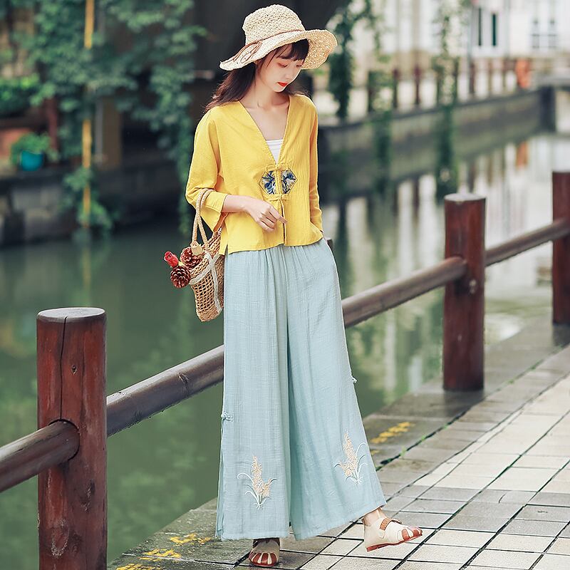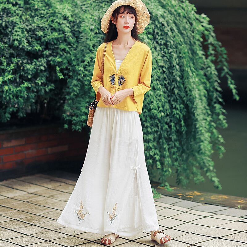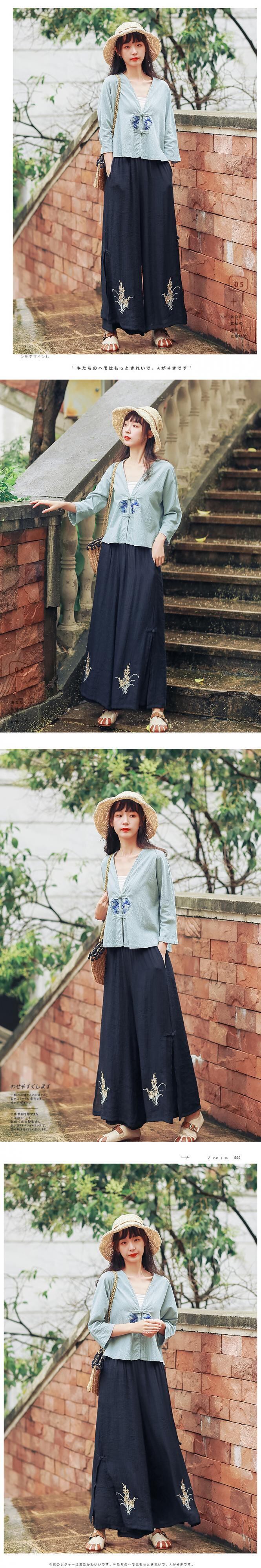 2021年レトロな文芸綿とリネンのワイドレッグパンツの女性夏の2層キュロット、刺繡が緩いプラスサイズのカジュアルなヨガパンツの女性 コットン 刺繍 大きめサイズ サマー 夏物 TB2-12 TB2-1255407490537