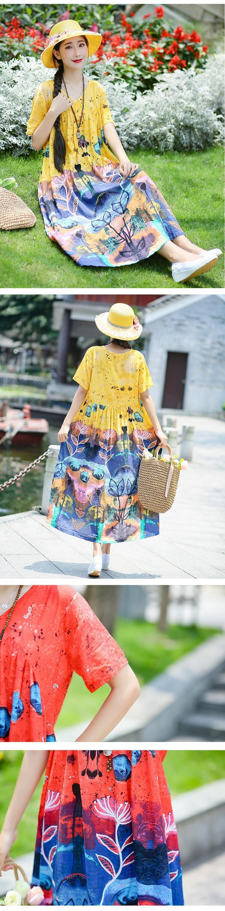 エスニックスタイルのコットンとリネンのプリントビッグスイングドレス2021夏の新製品レトロな文学とアートVネックプラスサイズの半袖ドレス 大きめサイズ サマー 夏物 TB2-12 TB2-121923795554
