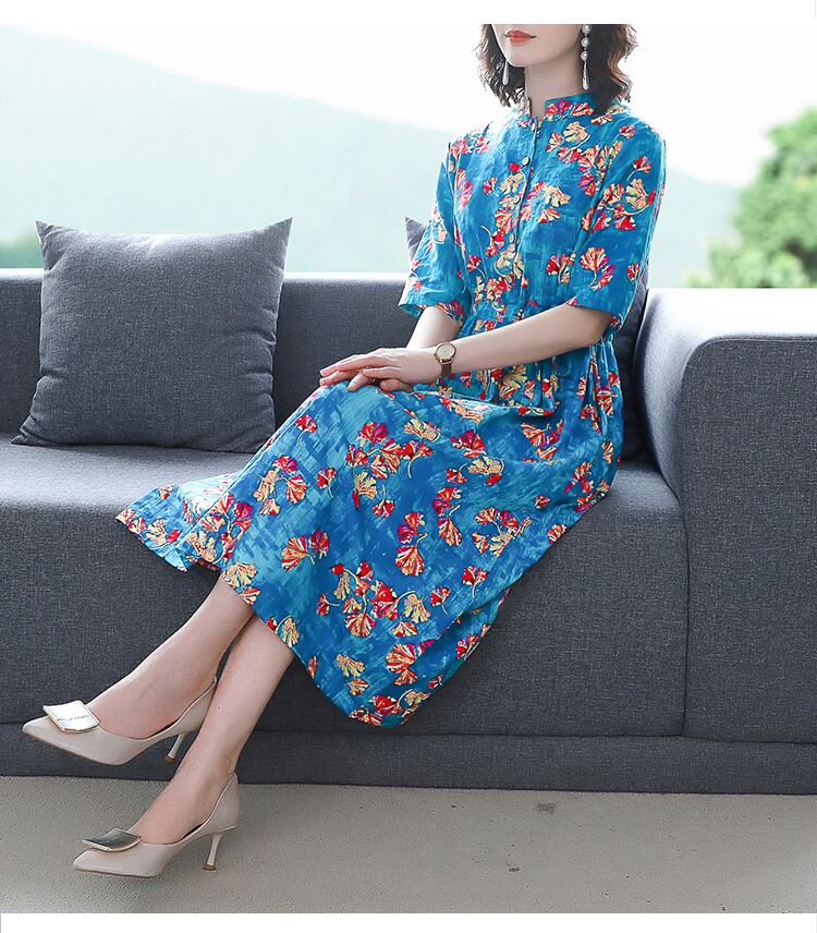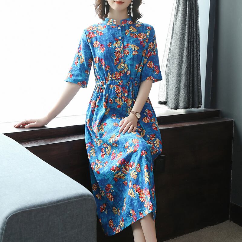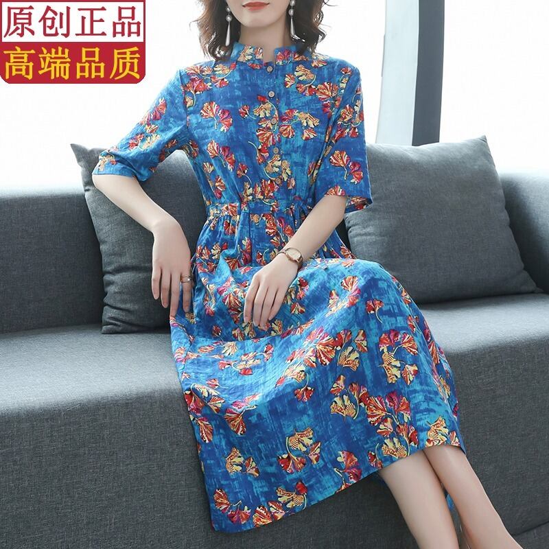 コットンとリネンのドレスの文学的なウエストは細く、気質の女性の2021年の新しい夏のウエスタンフローラル半袖ミディスカート サマー 夏物 花柄 TB2-12 TB2-1259340000804