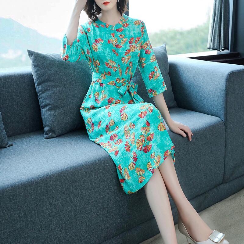 綿とリネンのドレスのウエストは細く、気質の女性の2021年の新しい春の花の七分袖ラミーロングスカート コットン スプリング 春物 花柄 TB2-12 TB2-1279220628802