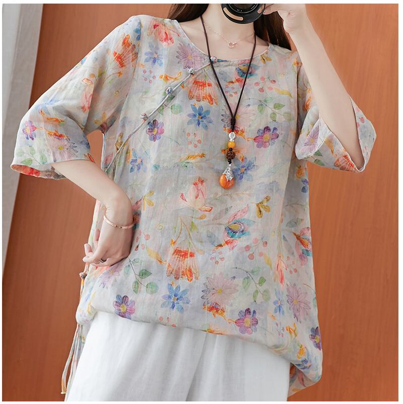 夏の新エスニックスタイルレトロディスクボタンラミーシャツナショナルスタイル気質プリント漢服ラウンドネックミドル丈トップ サマー 夏物 Oネック TB2-12 TB2-128120564362