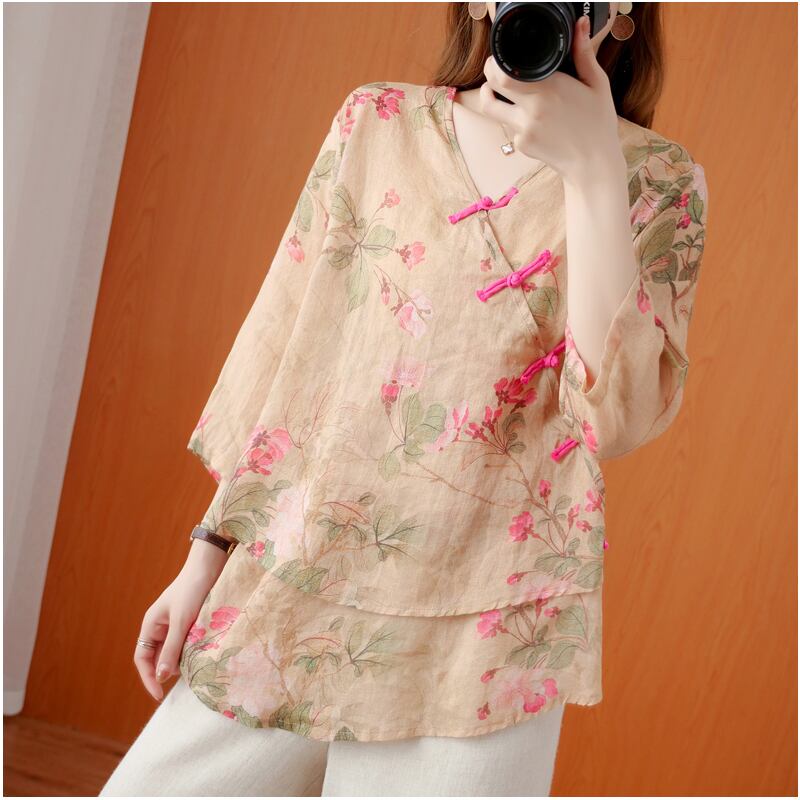 2021年夏の新作文芸ルーズラージサイズ薄片ラミーディスクボタンエスニックスタイルレトロオールマッチシャツブラウス 大きめサイズ サマー 夏物 TB2-12 TB2-1287187740024