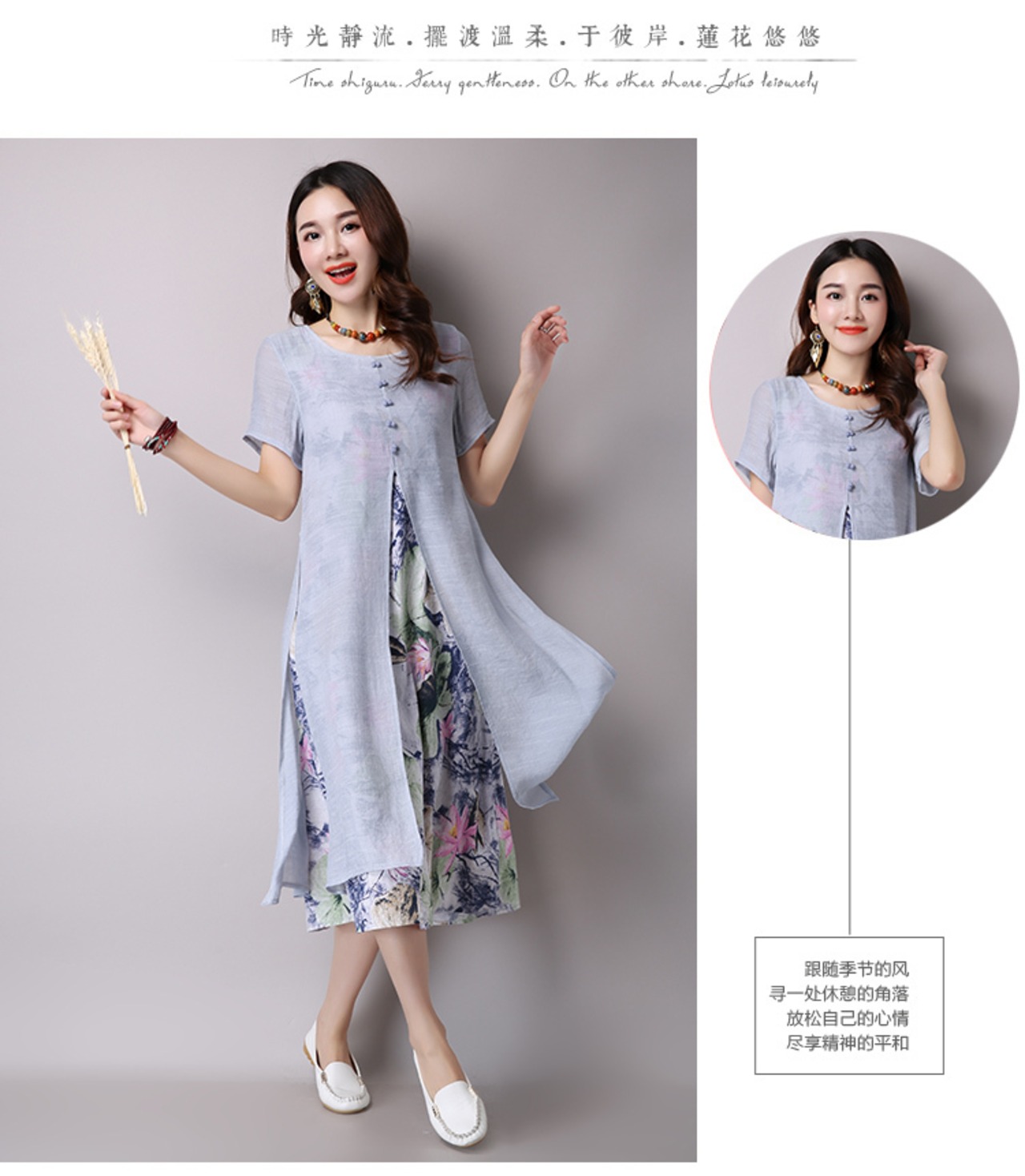 2021年夏の文学と芸術の大きなサイズの綿とリネンのロングスカートエスニックスタイルのインク印刷半袖ドレス偽の2つの大きなスイングスカート コットン 大きめサイズ サマー 夏物 TB2-12 TB2-1278205347779