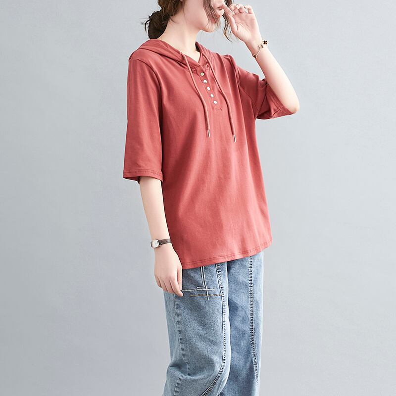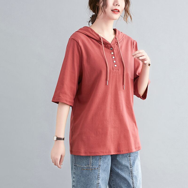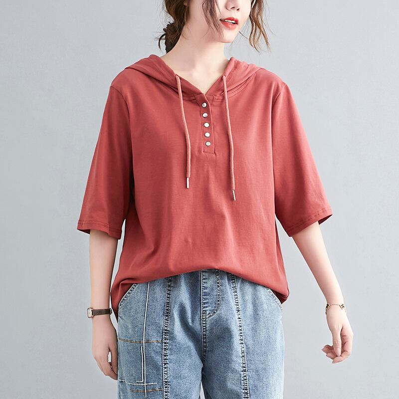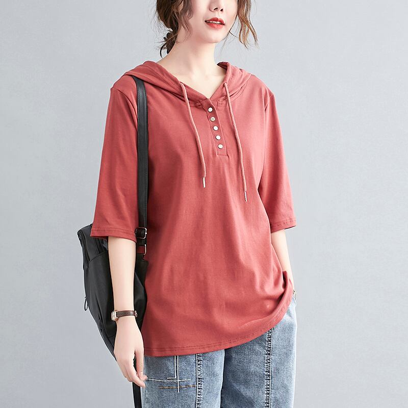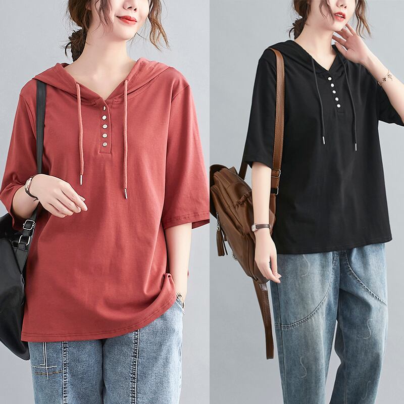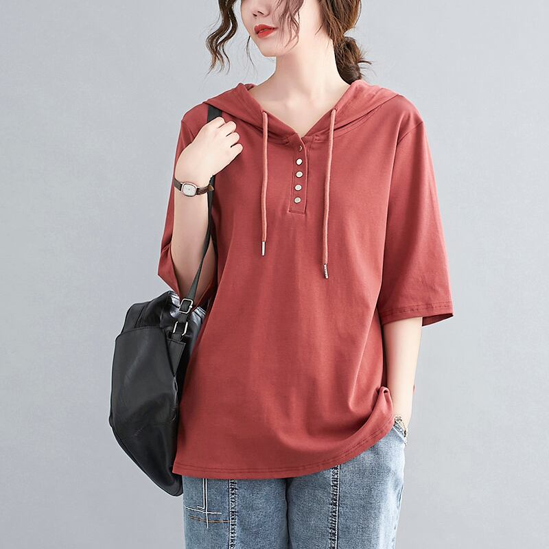 ラージサイズのレディースサマーソリッドカラーフード付き半袖Tシャツレディースルーズバージョンのベリーシンナーボトミングシャツ 大きめサイズ 夏物 TB2-8 TB2-830044981582