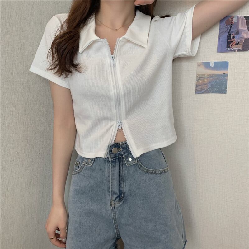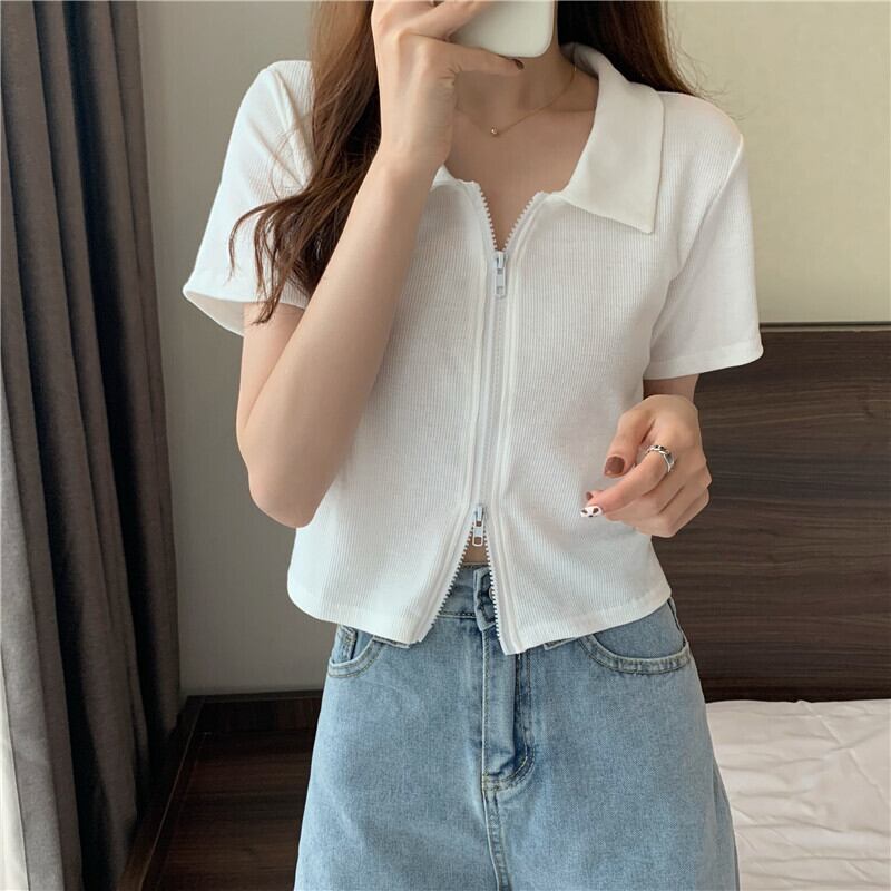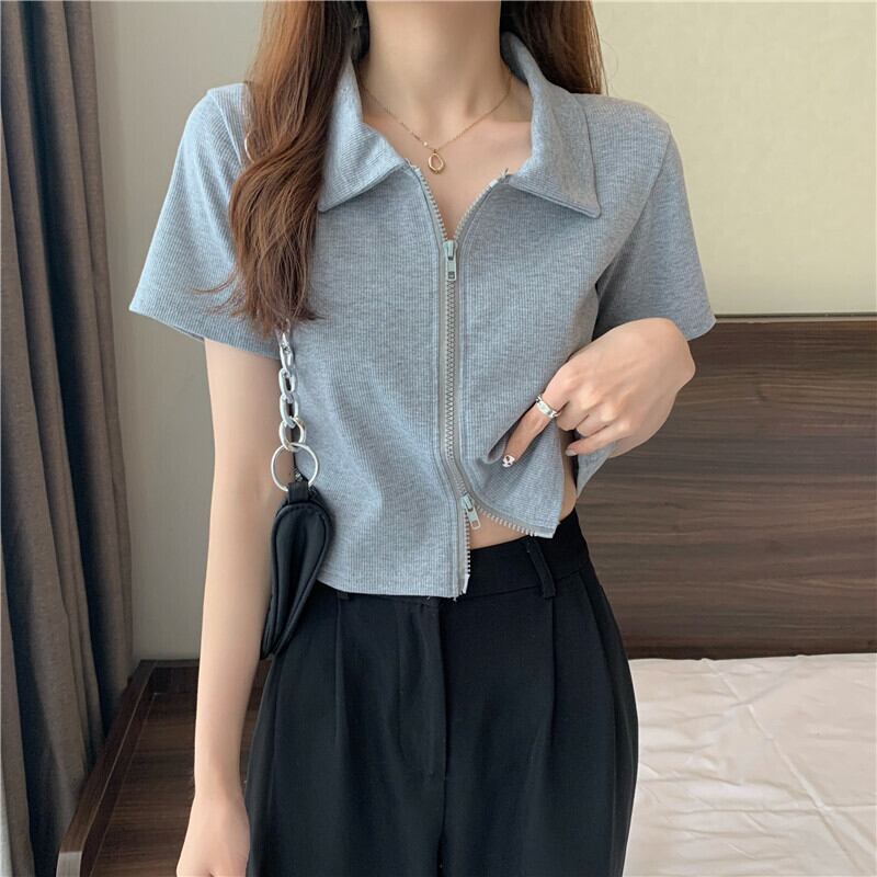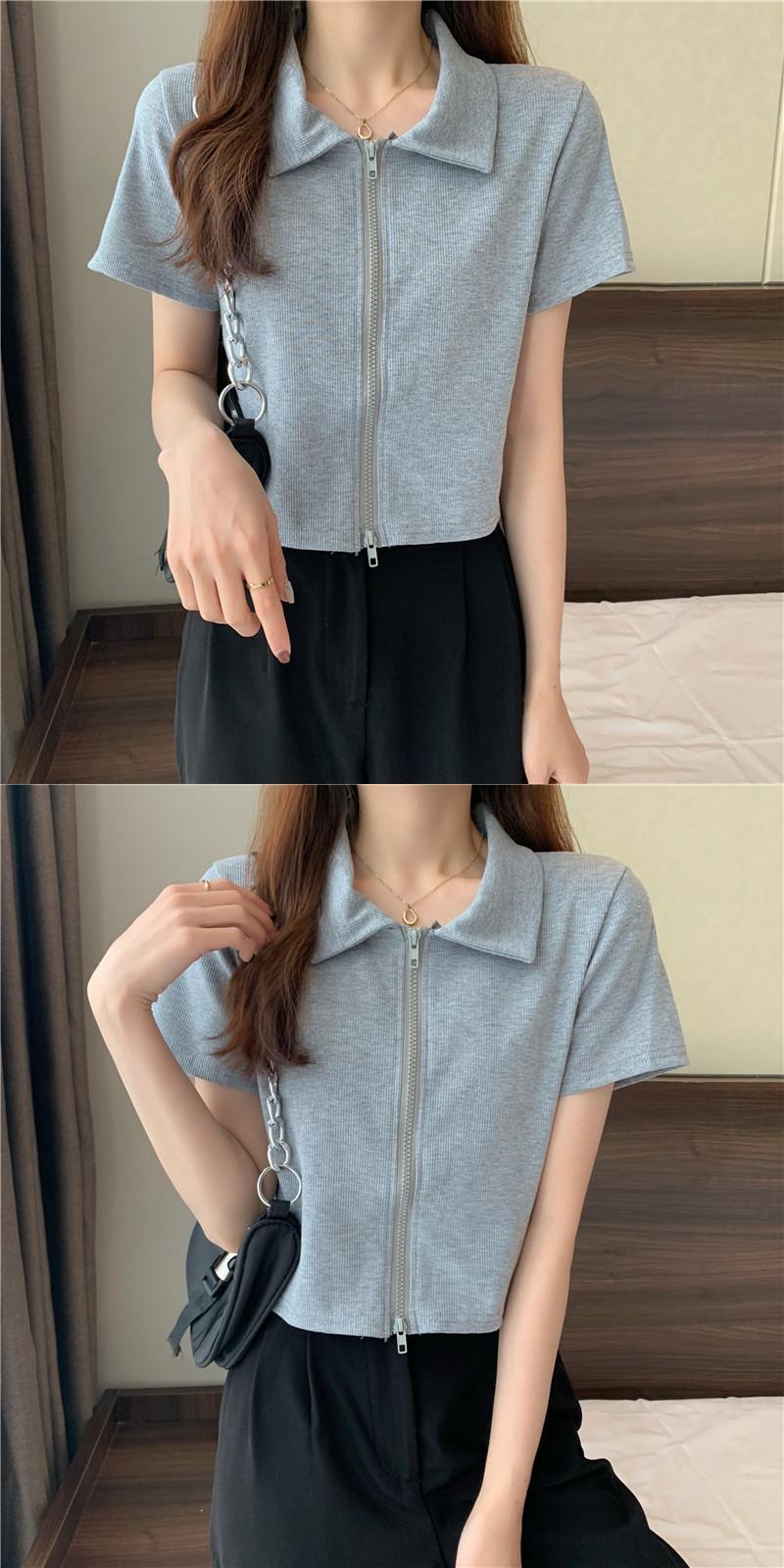 ブラックポロラペルアイスシルクニットショートTシャツトップ、ハイウエストパンツデザインニッチな夏の半袖女性 ハイウェスト サマー 夏物 TB2 TB23051827845