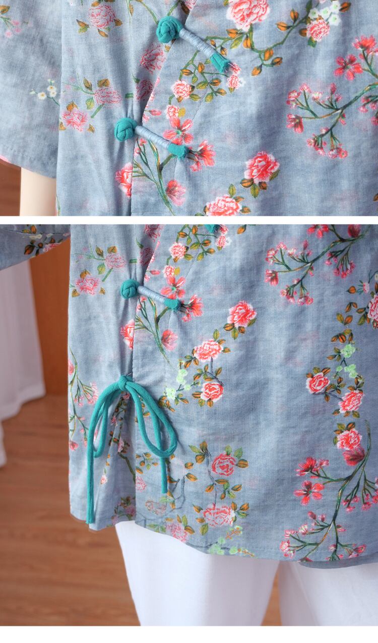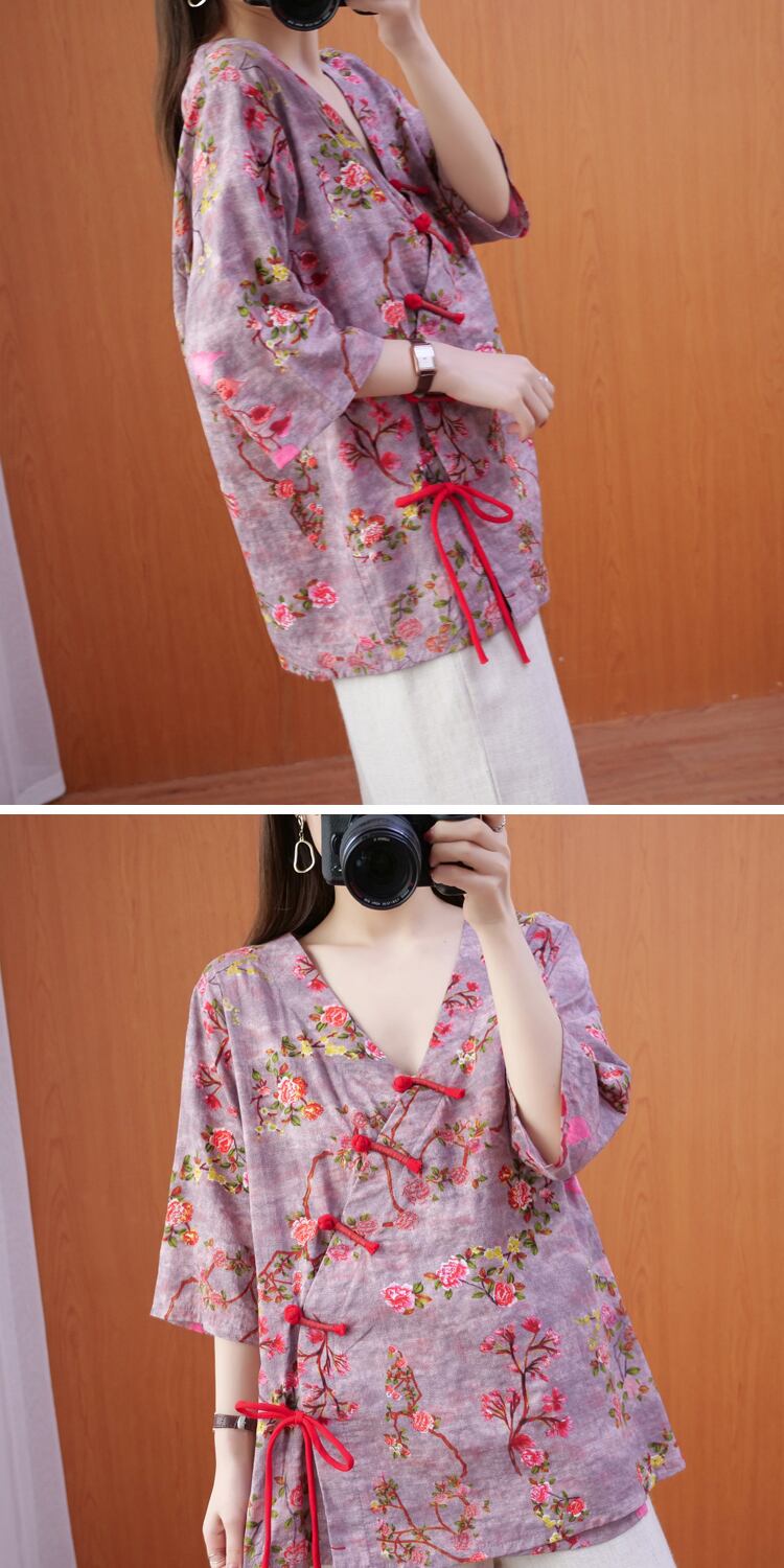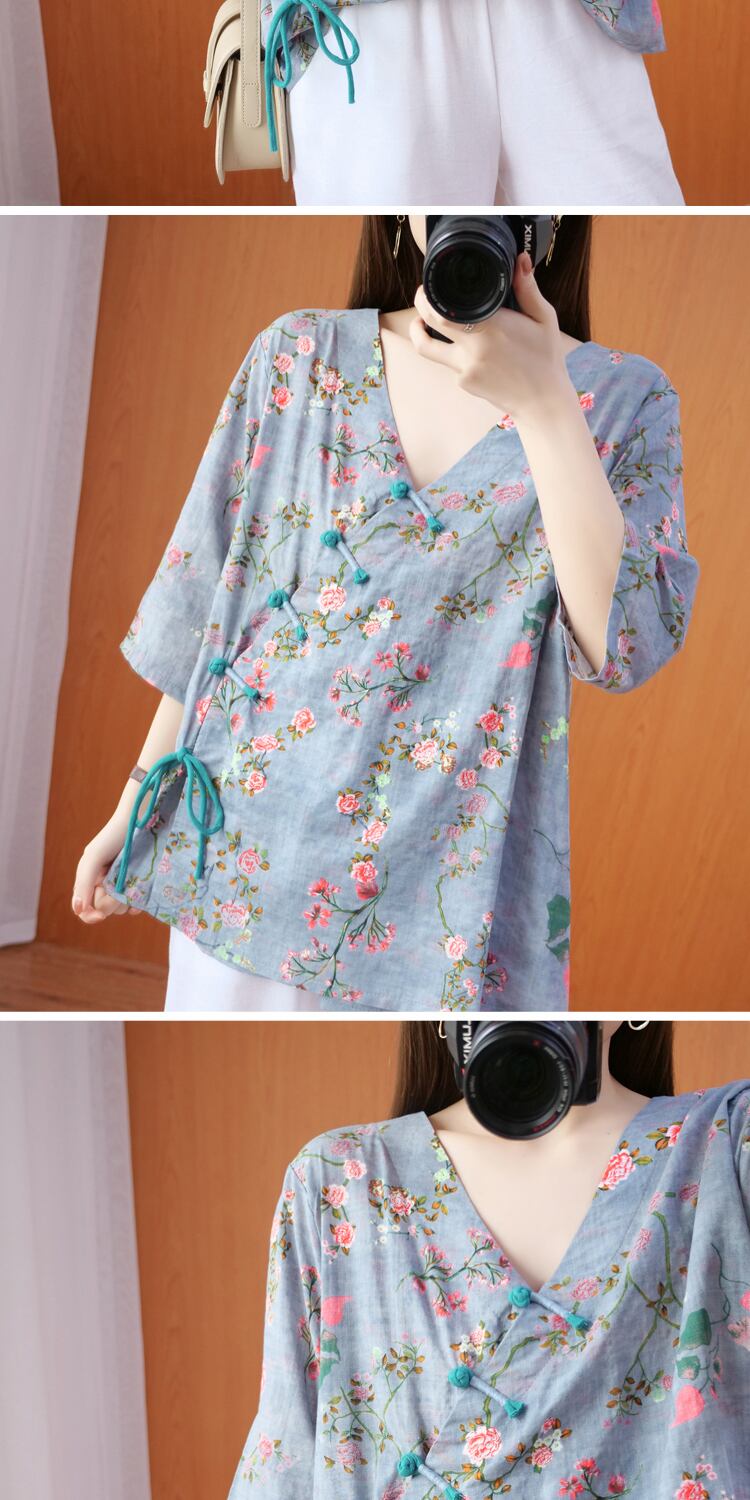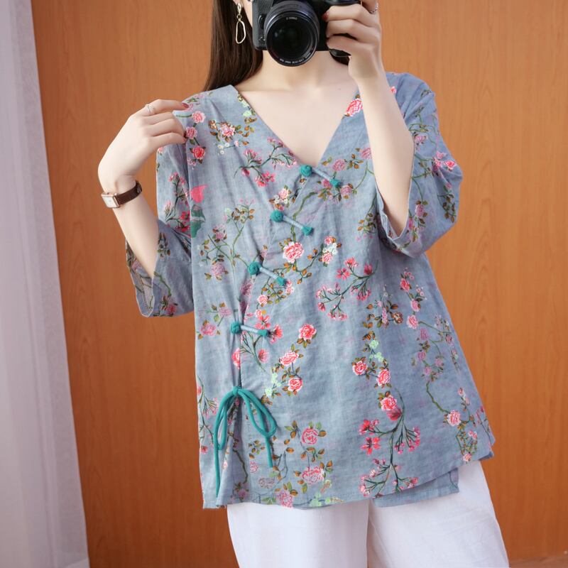 2021年の新しい中国風Tシャツコットンとリネンの気質斜めのレースアップバックルトップ半袖花柄Vネックシャツの女性 TB2-12 TB2-1269709964914