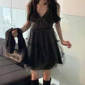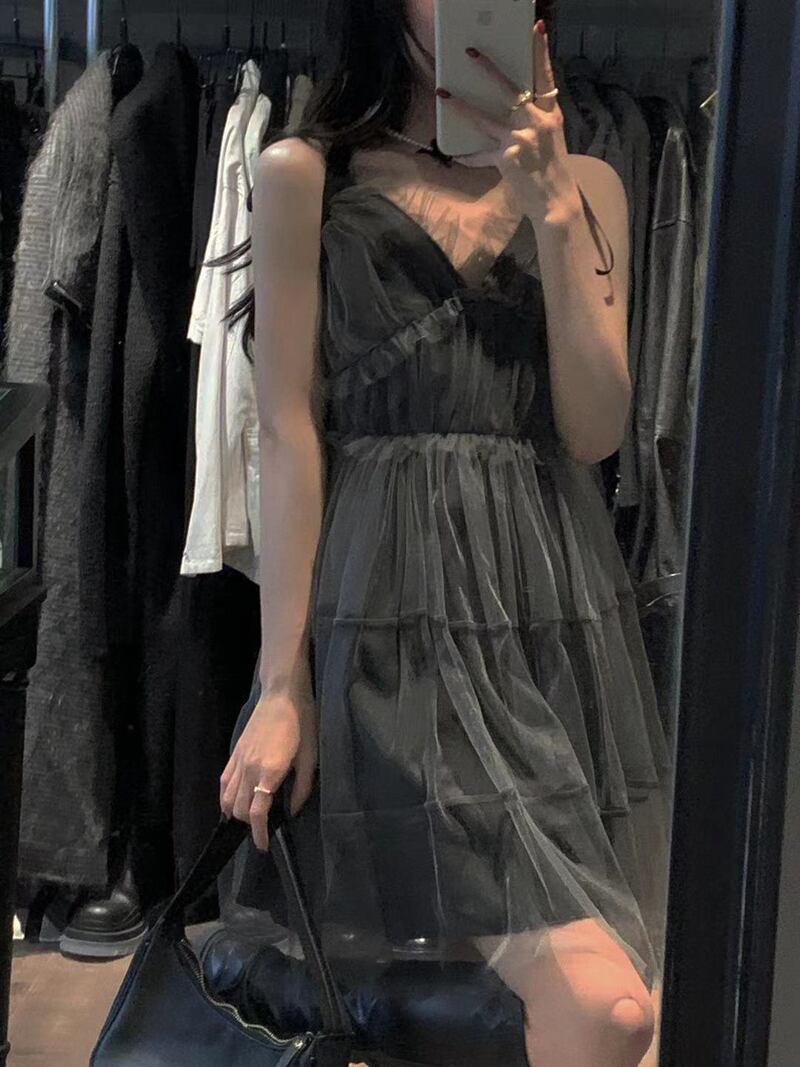 スリングドレスレディース2021年春新作メッシュスカートデザインセンスニッチVネックセクシー気質ミドル丈スカート スプリング 春物 TB2 TB276790050947