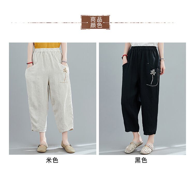 夏の文学とアートレトロ刺繍コットンとリネンハーレムパンツ女性ルーズリネンカジュアルパンツオールマッチ伸縮性ウエスト9ポイントパンツ エラスティック サマー 夏物 TB2-12 TB2-1256394522906