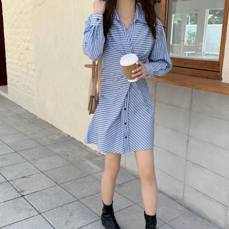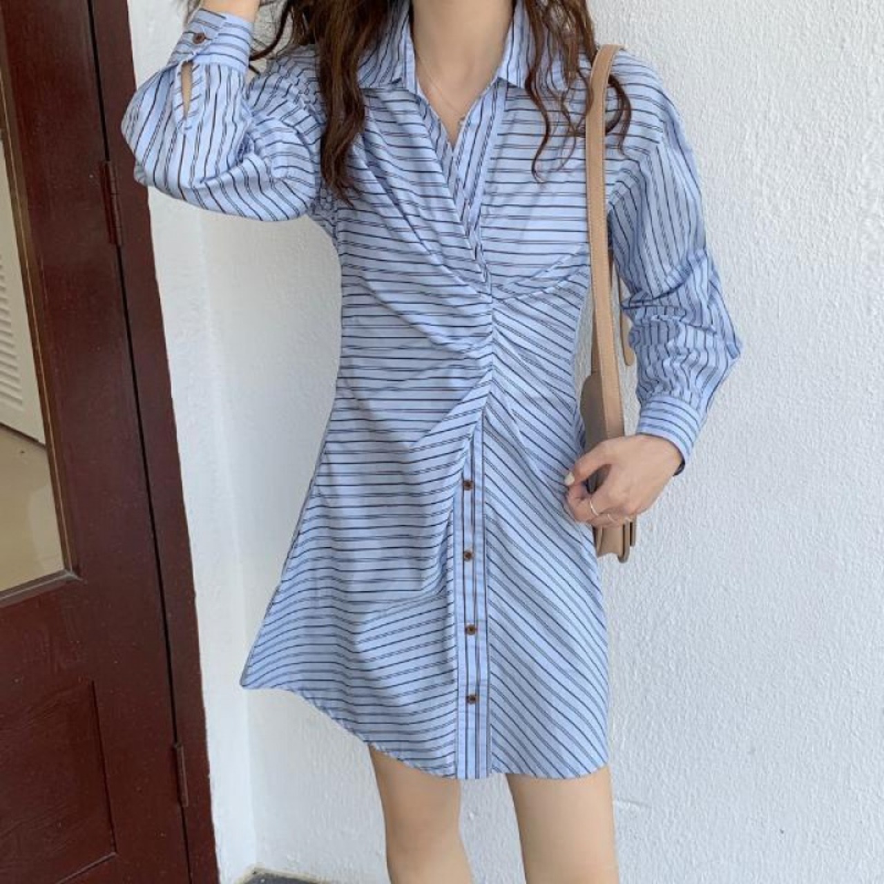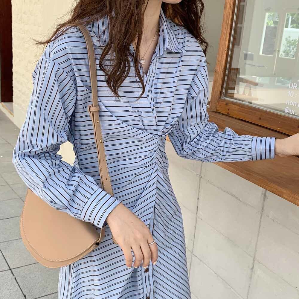 小さな新鮮な春先と秋の新しいインシャツプリーツドレス長袖ストライプウエストシャツスカートは白です ロング ホワイト スプリング 春物 オータム 秋物 TB2-5 TB2-559295384930