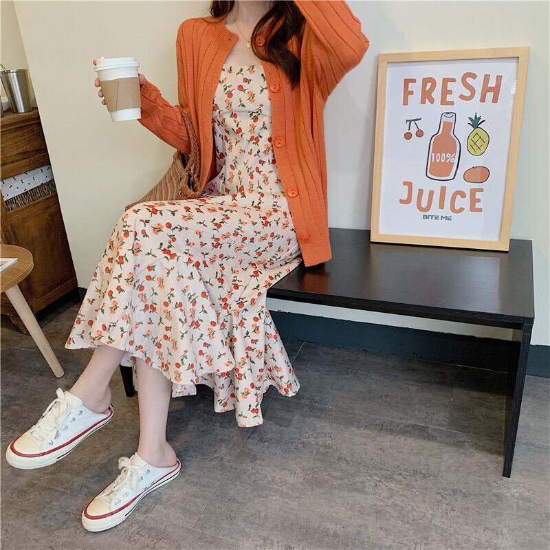 ファットシスター気質サスペンダースカートフローラルドレス、年齢を減らした長袖ニットカーディガンで肌を覆い、薄手のスーツスカート大サイズ ロング 大きめサイズ 花柄 TB2-10 TB2-1073151479888