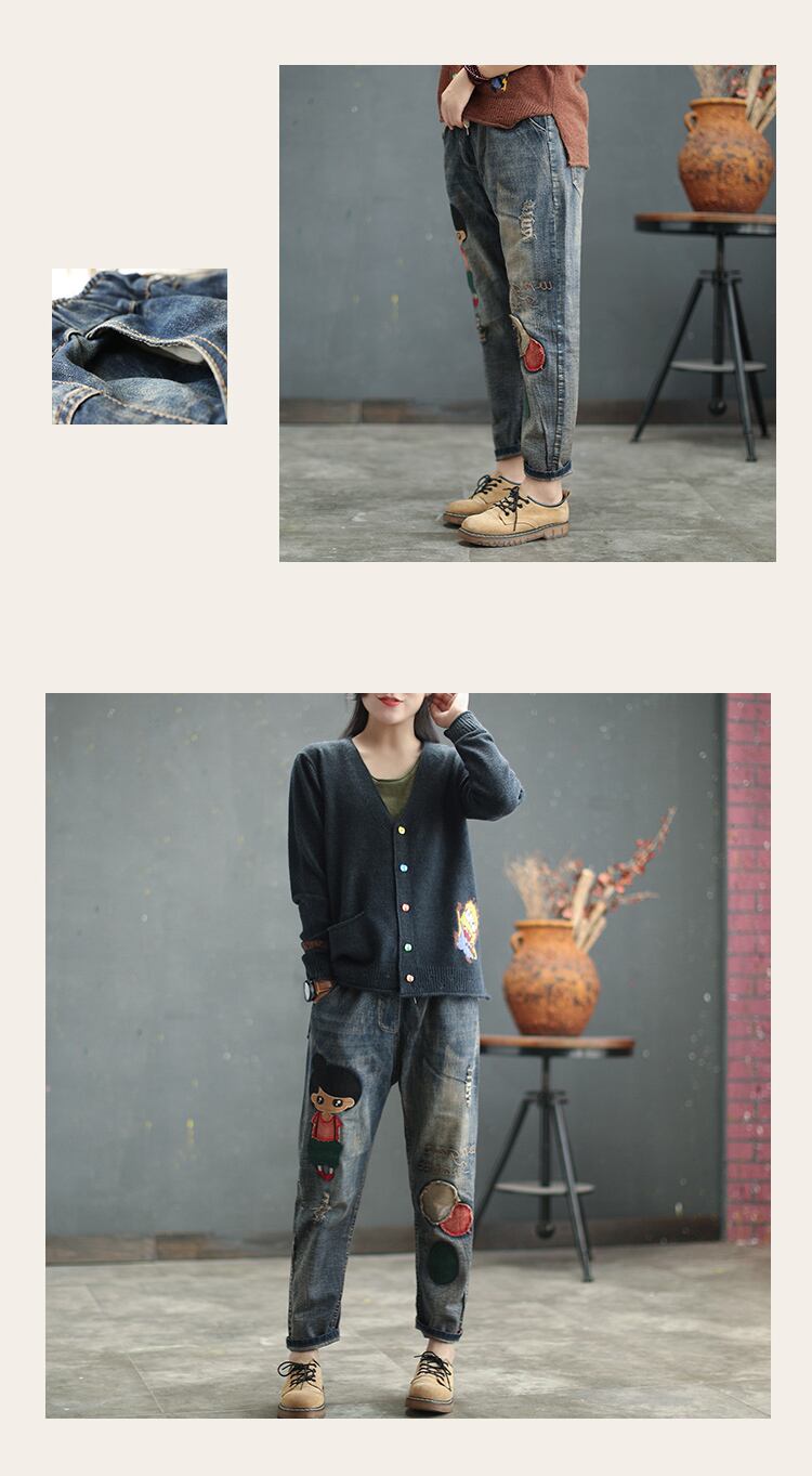 2019年春新作レトロ刺繍ジーンズレディースパンツ伸縮性ウエストレースアップリケ着用ハーレムパンツ エラスティック スプリング 春物 TB2-11 TB2-1179103634265