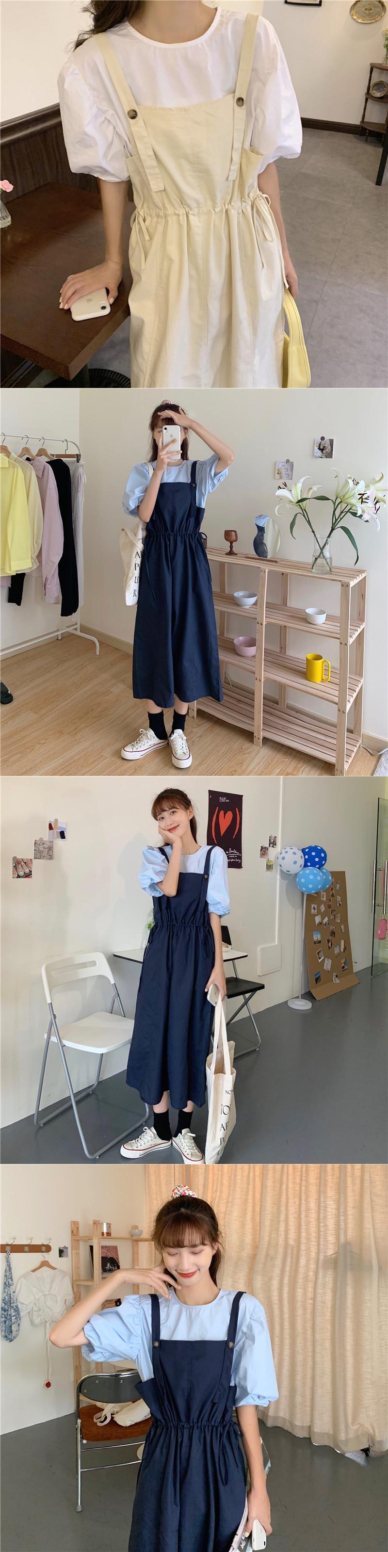色:ホワイトトップ,ブルートップ,ネイビーブルーのサスペンダースカート,アプリコットストラップドレス