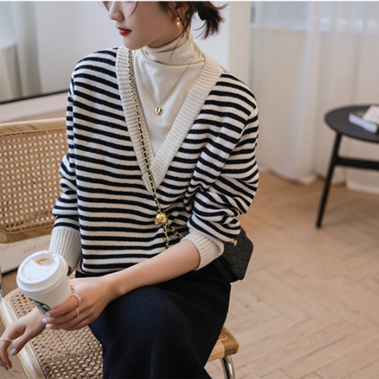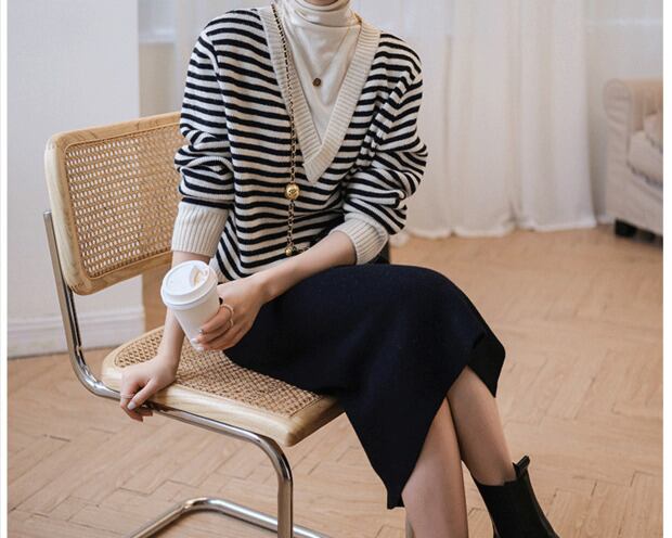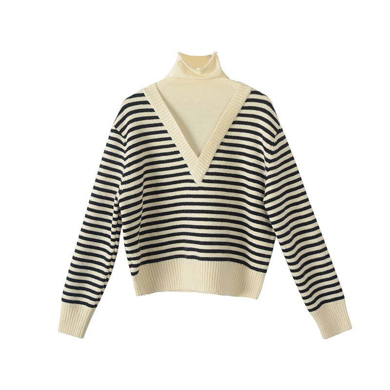 ファットシスタールーズハイネックストライプセーター女性2021新しいフェイクツーピースレトロニットセーターボトミングシャツラージサイズ 大きめサイズ TB2-10 TB2-101616178037