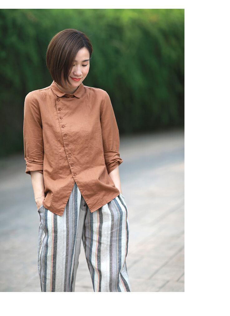 レトロな春と夏の新しいスタイルの綿とリネンの婦人服、文芸とレジャーの傾斜した襟の緩い無地のリネンシャツ、女性の襟の長袖 ロング コットン スプリング 春物 サマー 夏物 ソリッドカラー TB2-11 TB2-1135003024575