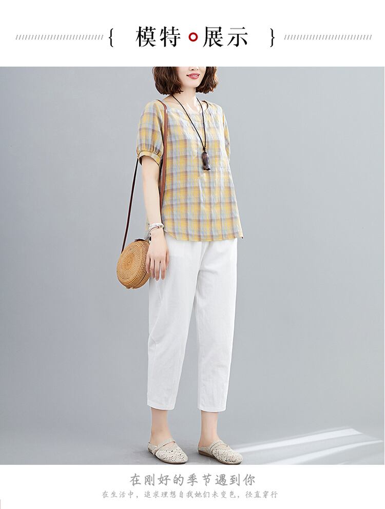 ラージサイズのコットンとリネンのスーツの女性2021年夏の新しい半袖チェック柄トップルーズクロップドカジュアルパンツツーピーススーツ 大きめサイズ サマー 夏物 TB2-12 TB2-1277550478635