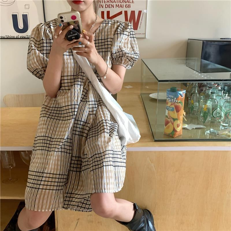 チェック柄パフスリーブワンピース2021ルーズVネック気質ミドル丈スカート女性夏の新作ドールスカートバージョン サマー 夏物 TB2-5 TB2-559548373863