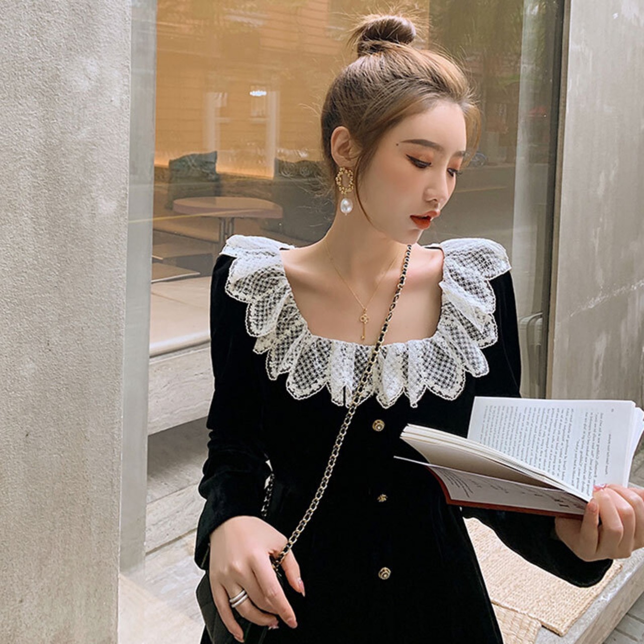 スーパーフェアリー気質レースベルベットドレス秋冬は薄く見えるレトロブラックショートスカートラージサイズカバーミートボトムスカートファットmm 大きめサイズ オータム 秋物 ウィンター 冬物 TB2-10 TB2-1056738003811