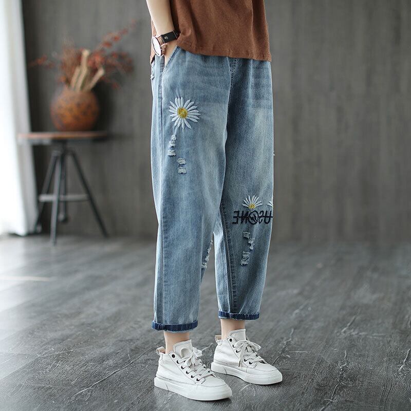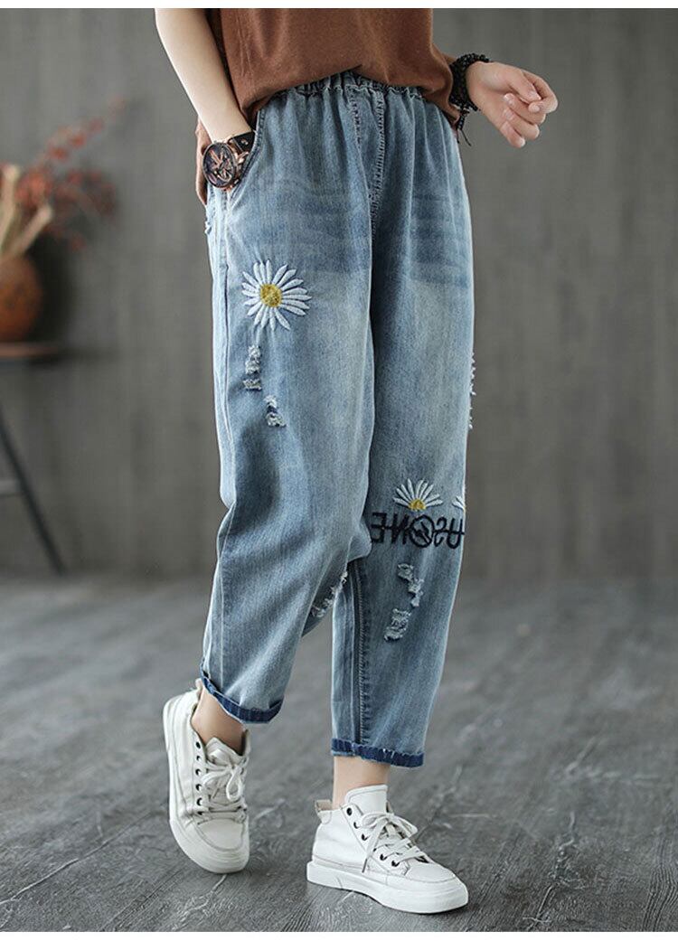 2020年春夏新作淡色ウォッシュデニムクロップドパンツレディースパンツ伸縮性ウエスト刺繡スモールデイジーカジュアルパンツ レッド 刺繍 エラスティック スプリング 春物 サマー 夏物 TB2-11 TB2-1188523745953