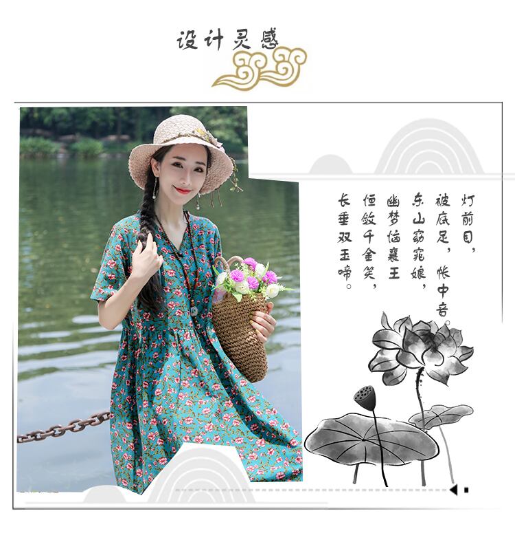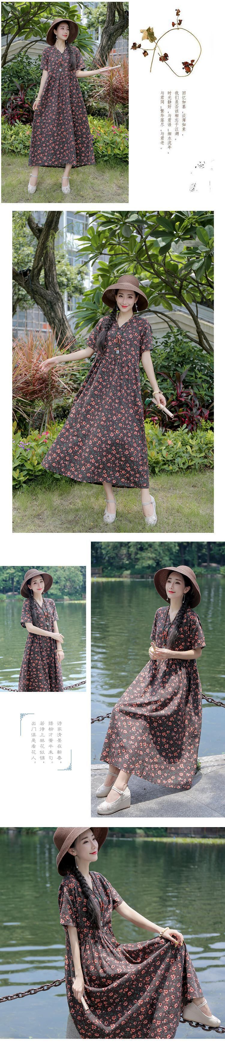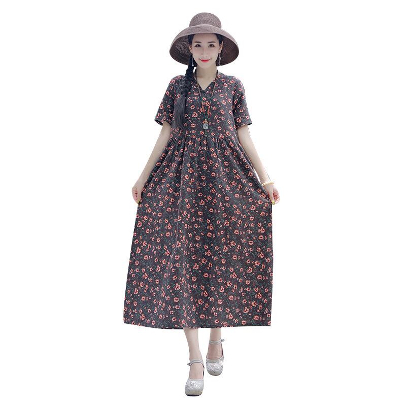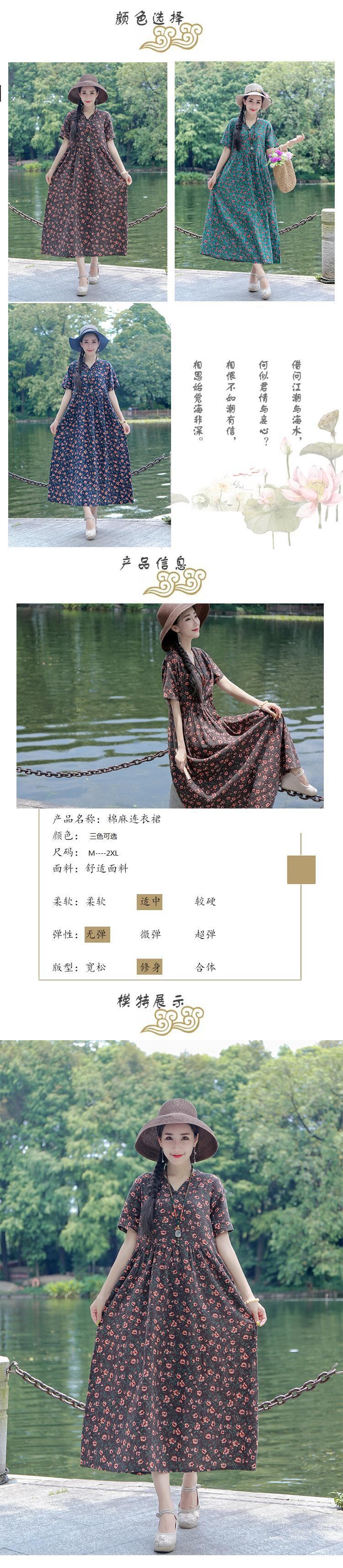 2021年夏の新しいレトロなエスニックスタイルのコットンとリネンのプリントVネック半袖ドレスルーズで薄い気質のロングスカート サマー 夏物 TB2-12 TB2-1276806208200