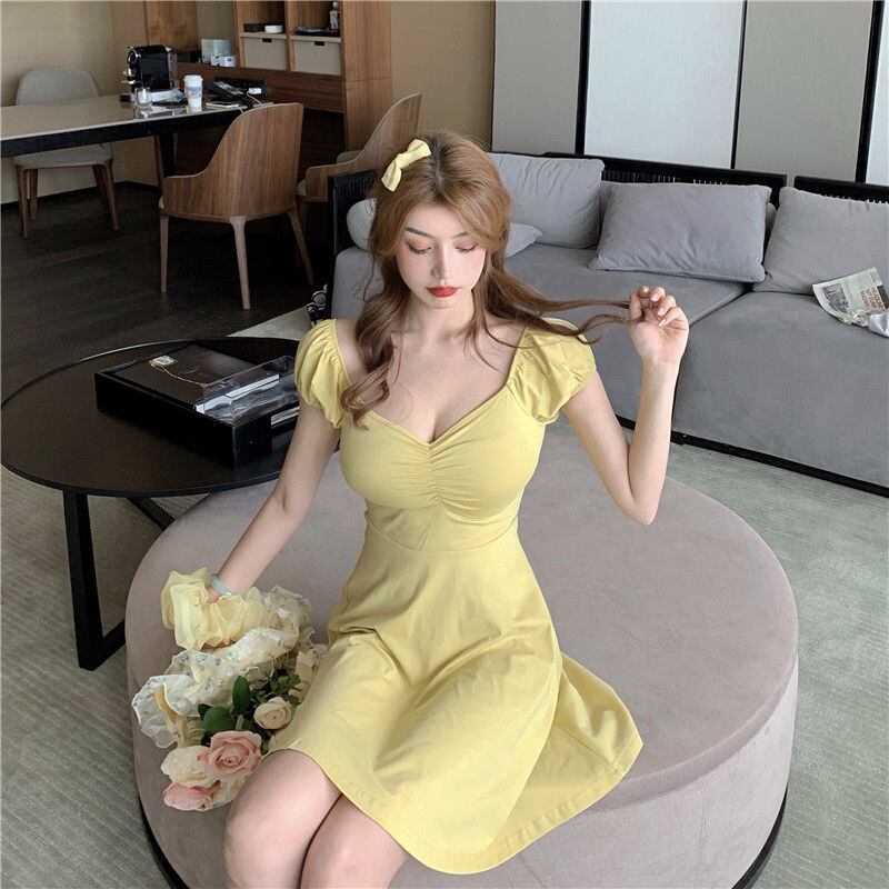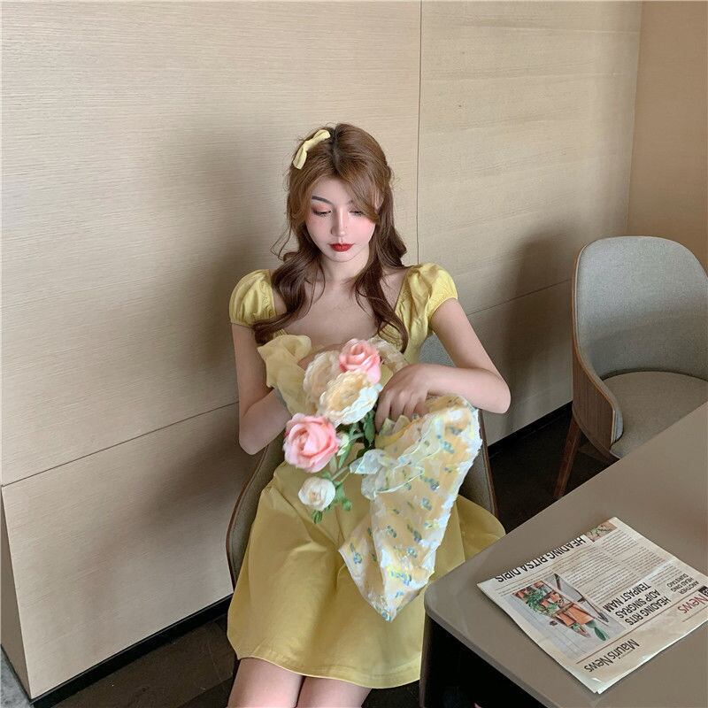 ドレスレトロヘップバーンスタイルスクエアネック気質スカート夏女性2021新しい黄色のウエストaラインショートスカート サマー 夏物 スクウェア TB2-5 TB2-549024500969