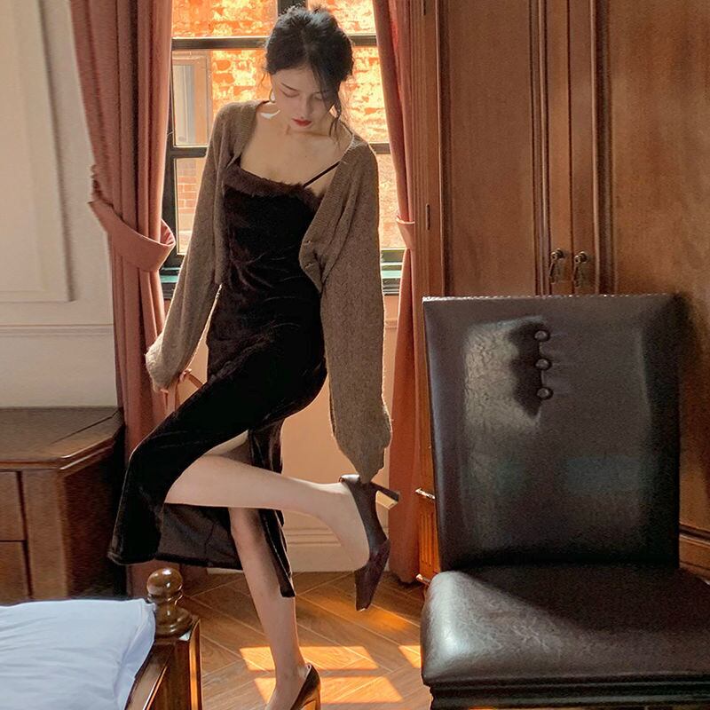 香港スタイルのレトロ2020年女性の秋の新しいベルベットサスペンダースカートスリムで薄いハイウエストスクエアネックスプリットドレス ハイウェスト オータム 秋物 スクウェア TB2-5 TB2-584335236275