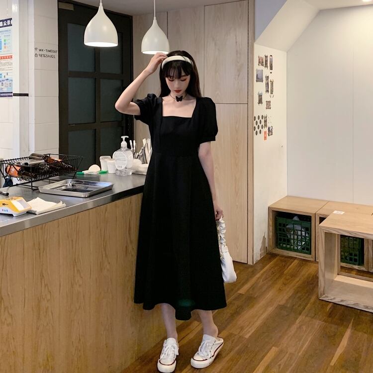 ファットシスターレトロブラックドレス女性2020夏の新しいスタイル気質スクエアネックオーバーニーロングリトルブラックドレスプラスサイズ 大きめサイズ サマー 夏物 スクウェア TB2-10 TB2-1022222943858