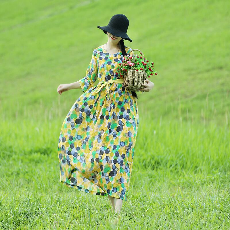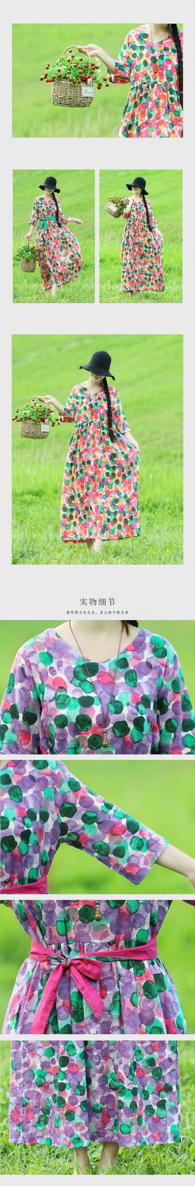 2021年春夏の新しいエスニックスタイルのコットンとリネンの水玉模様のルーズラージサイズの女性用ラウンドネックウエストローブラージスイングドレス 大きめサイズ スプリング 春物 サマー 夏物 Oネック TB2-12 TB2-1282415044488