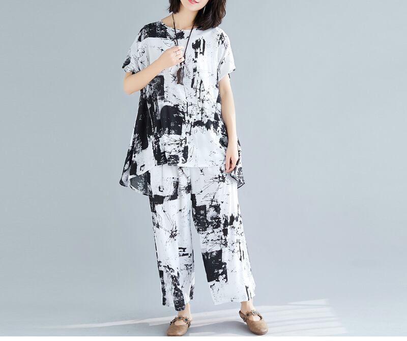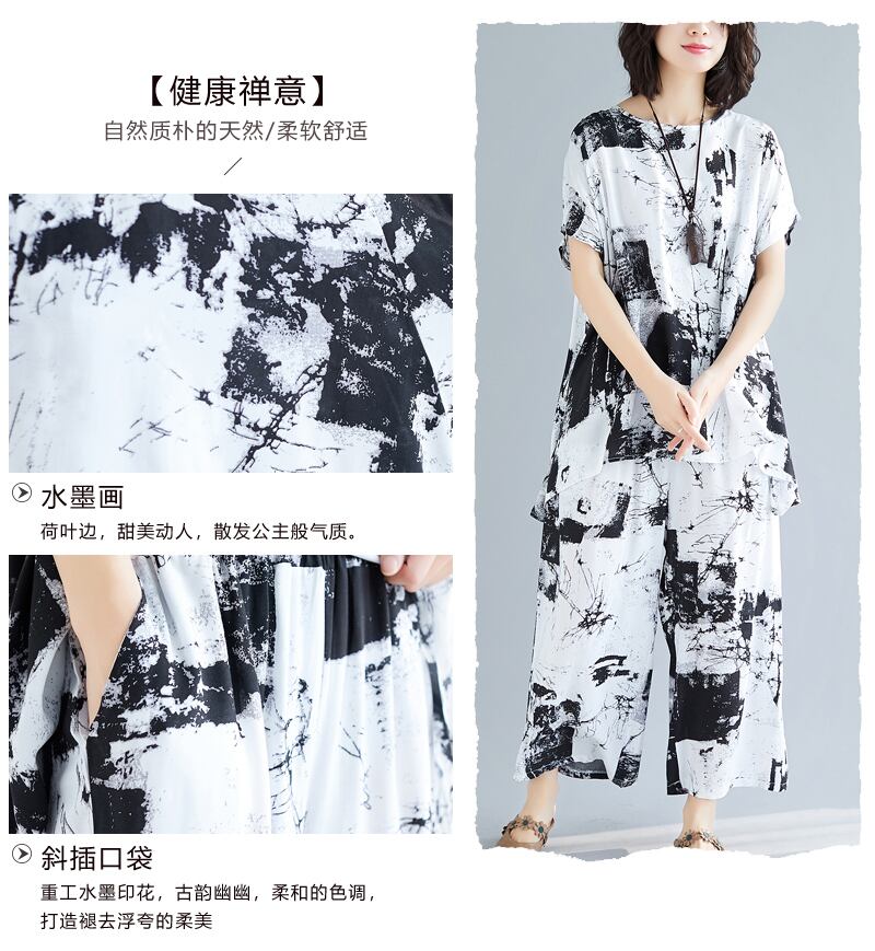 コットンとリネンのスーツの女性2021年夏の新しいナショナルスタイルのラージサイズのルーズTシャツツーピースワイドレッグパンツ 大きめサイズ サマー 夏物 TB2-12 TB2-1289750844098