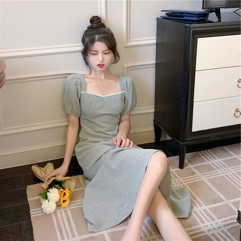 スクエアネックパフスリーブチェック柄フレンチロングスカート2020ニューウエストスリミングスタイル気質Aラインドレス女性夏 サマー 夏物 スクウェア TB2-5 TB2-516802710680