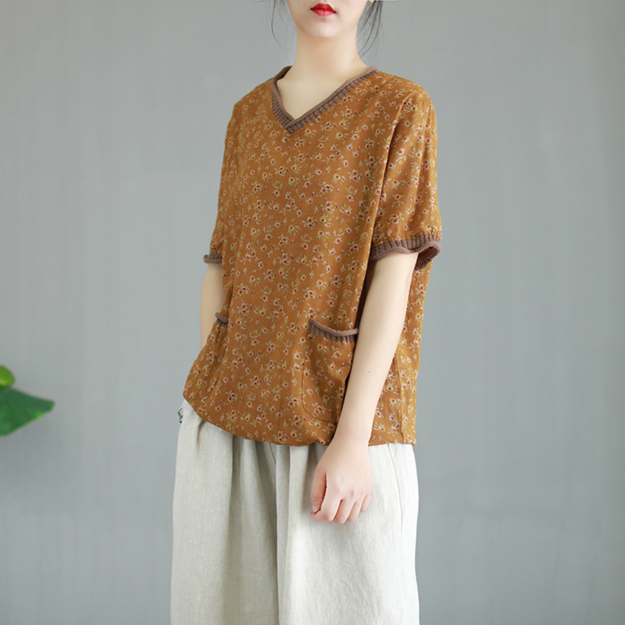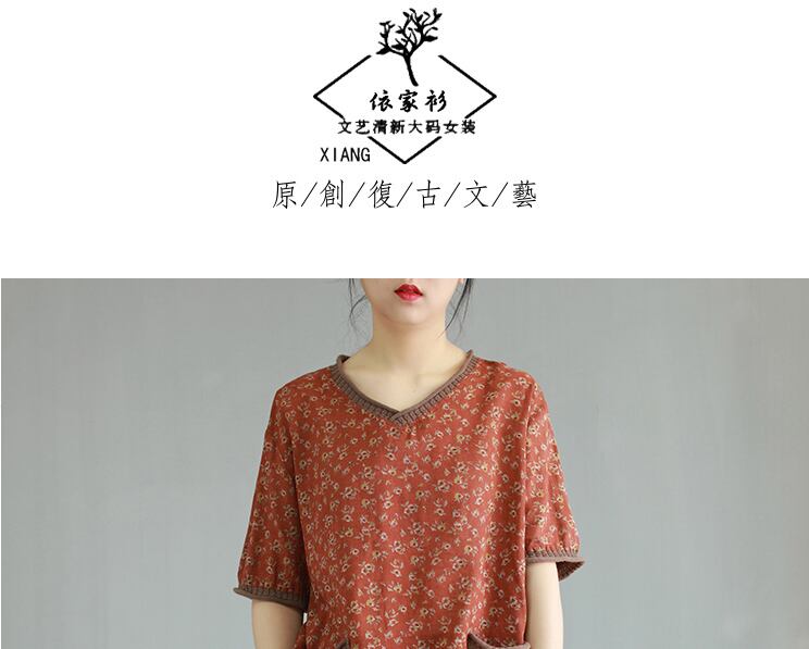 2020年夏の新しいカジュアルレトロリテラリーフローラルコットンとリネンのトップスは薄いVネック半袖ルーズTシャツレディースワイルドです サマー 夏物 花柄 TB2-11 TB2-1194308227318