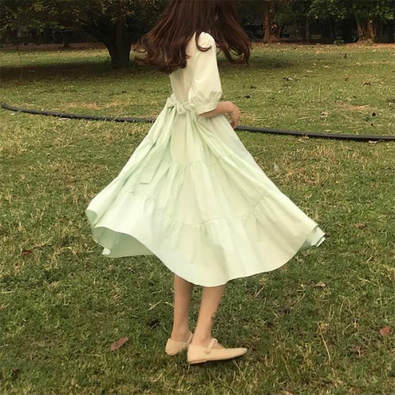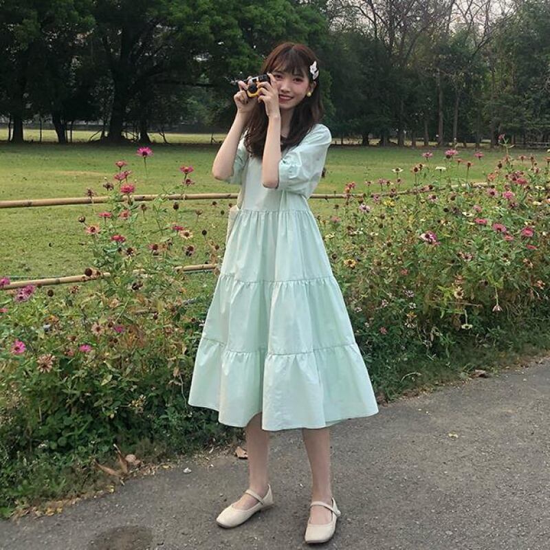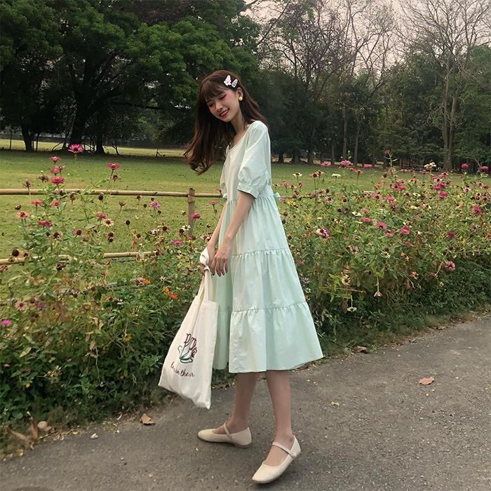 2021年夏新しい小さくてフレッシュでシンプルなカジュアルな薄いミドル丈のレースステッチAラインラウンドネックドレス女性 サマー 夏物 Oネック TB2-5 TB2-593397008356