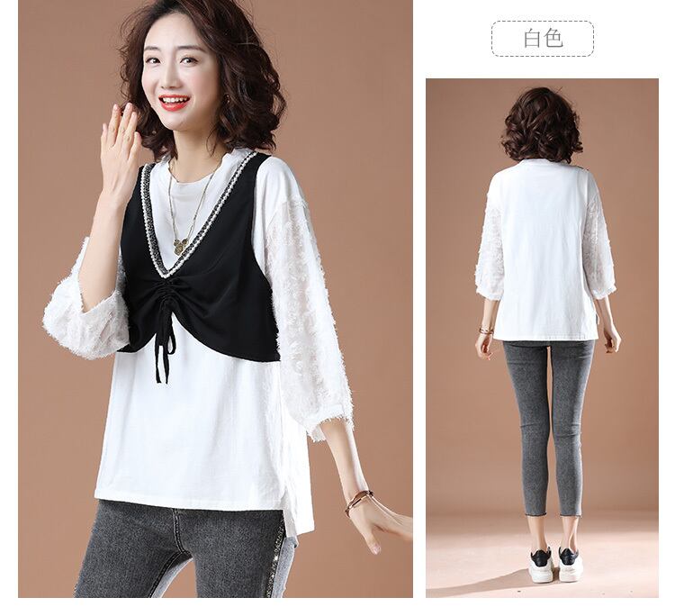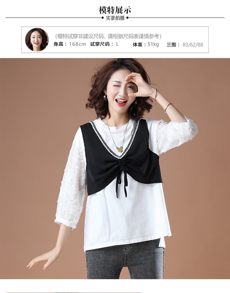 ファットシスターカバーベリーブラウス女性アインスタイルラージサイズレースステッチフェイクツーピース七分袖シャツ春夏新スタイル2021 大きめサイズ スプリング 春物 サマー 夏物 TB2-226884882441