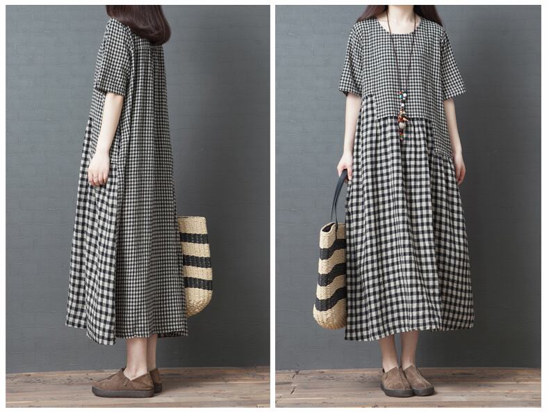 2020年夏新バージョンルーズプラスサイズレディースファッションイレギュラーステッチコットンとリネンチェック柄半袖ワンピース 大きめサイズ サマー 夏物 TB2-12 TB2-1213633943743