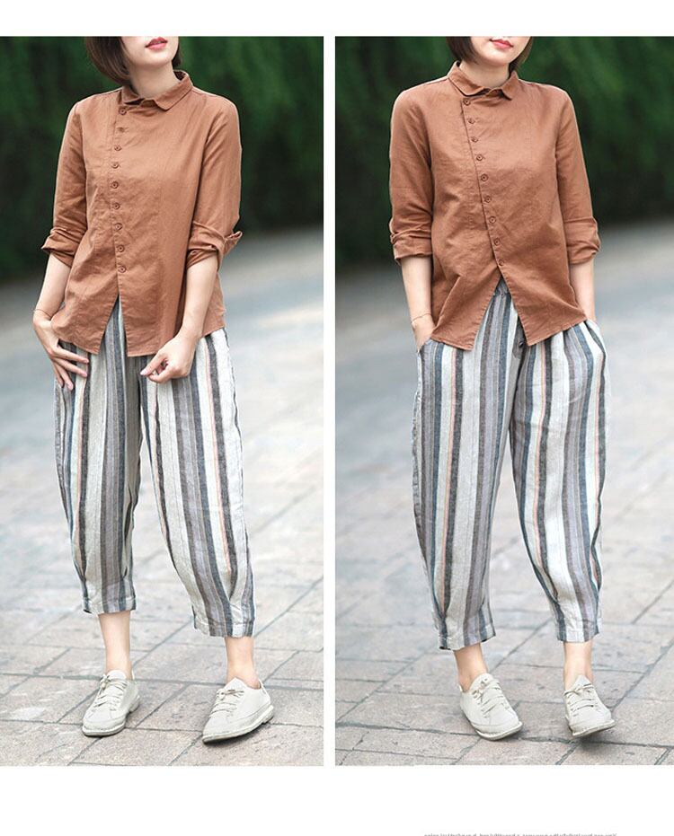 レトロな文学ラペル斜め前立て無地コットンとリネンシャツ女性2020春と夏のリネン長袖シャツルーズトップ ロング スプリング 春物 サマー 夏物 ソリッドカラー TB2-11 TB2-1113028090554