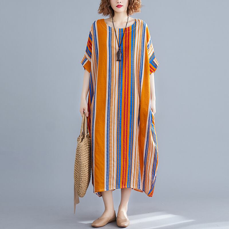 エクストララージサイズのレディースドレスファットシスターサマードレスニュースタイル2021お腹隠し肉ラウンドネックストライプ半袖ロングスカート 大きめサイズ 夏物 Oネック TB2-286649061955